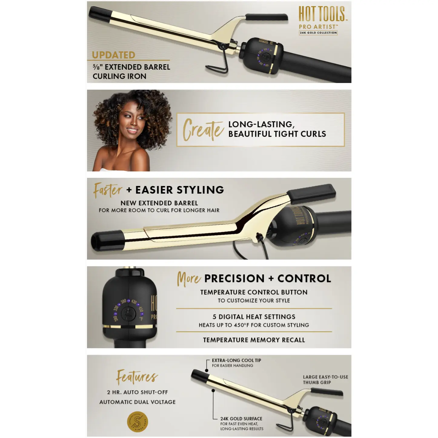 Hot Tools Pro Artist 24K Gold Extended Barrel Curling Iron is the tool you need to create all the long-lasting curls and waves you can imagine. Featuring a new extended barrel, this long barrel curling iron is perfect for styling longer lengths and hard-to-reach sections. The award-winning hair curling iron includes a styling clamp, helping to create smoother ringlet curls effortlessly. The 5/8 inch curling iron is perfect for beautiful tight curls, ensuring less hair damage and faster styling by allowing room to evenly wrap sections, heating every strand on the first pass. Equipped with the fan-favorite 24K Gold Technology, it heats up quickly and delivers consistent, long-lasting results. The updated design offers more precision and control with a temperature control button and temperature memory recall. With multiple digital heat settings reaching up to 450˚F, you can customize your style for all hair types. Elevate your hairstyling game with the Hot Tools Pro Artist 24K Gold Curling Iron Collection. Whether you're using a curling iron 5/8 inch or another variant, discover the perfect curler for you with Hot Tools curling iron.