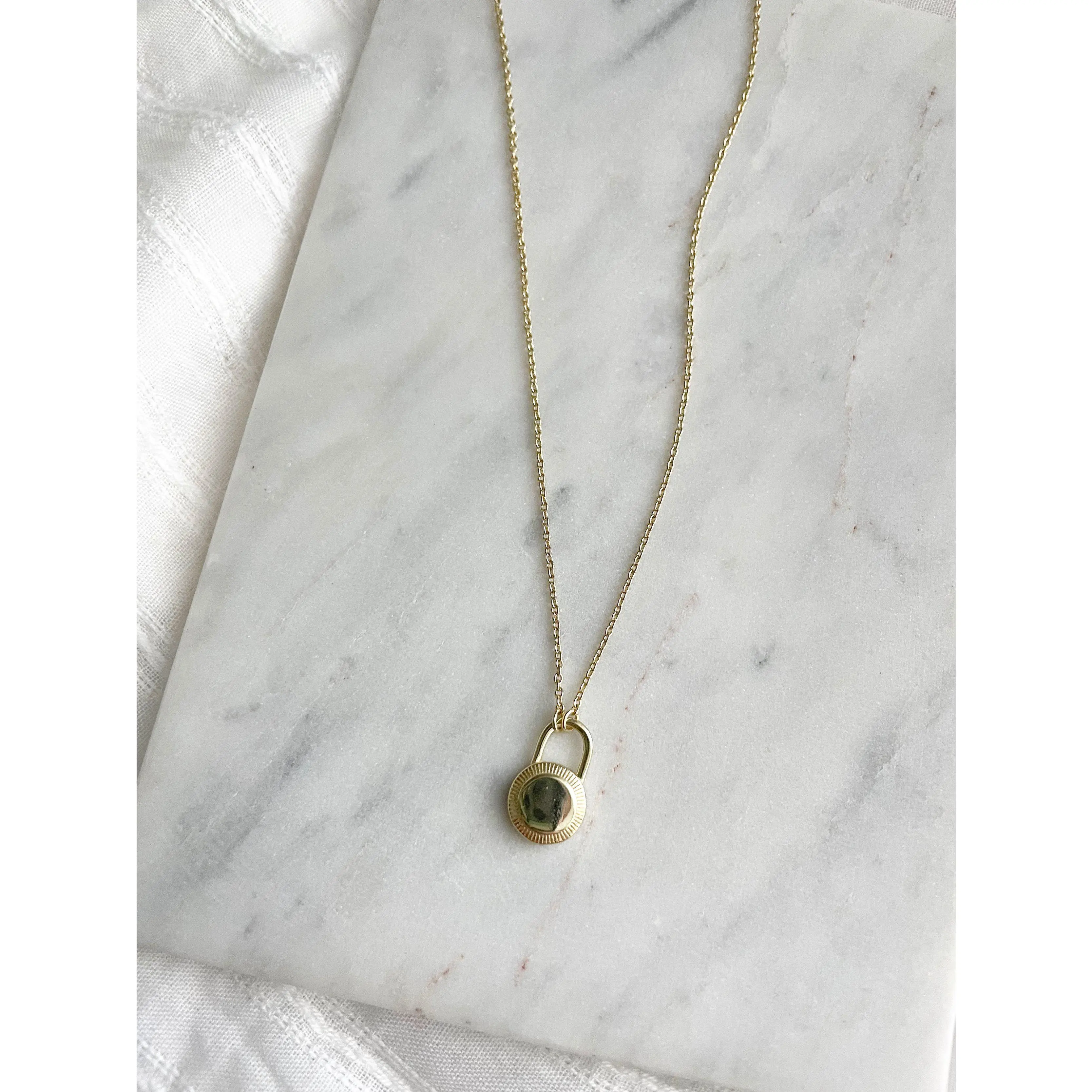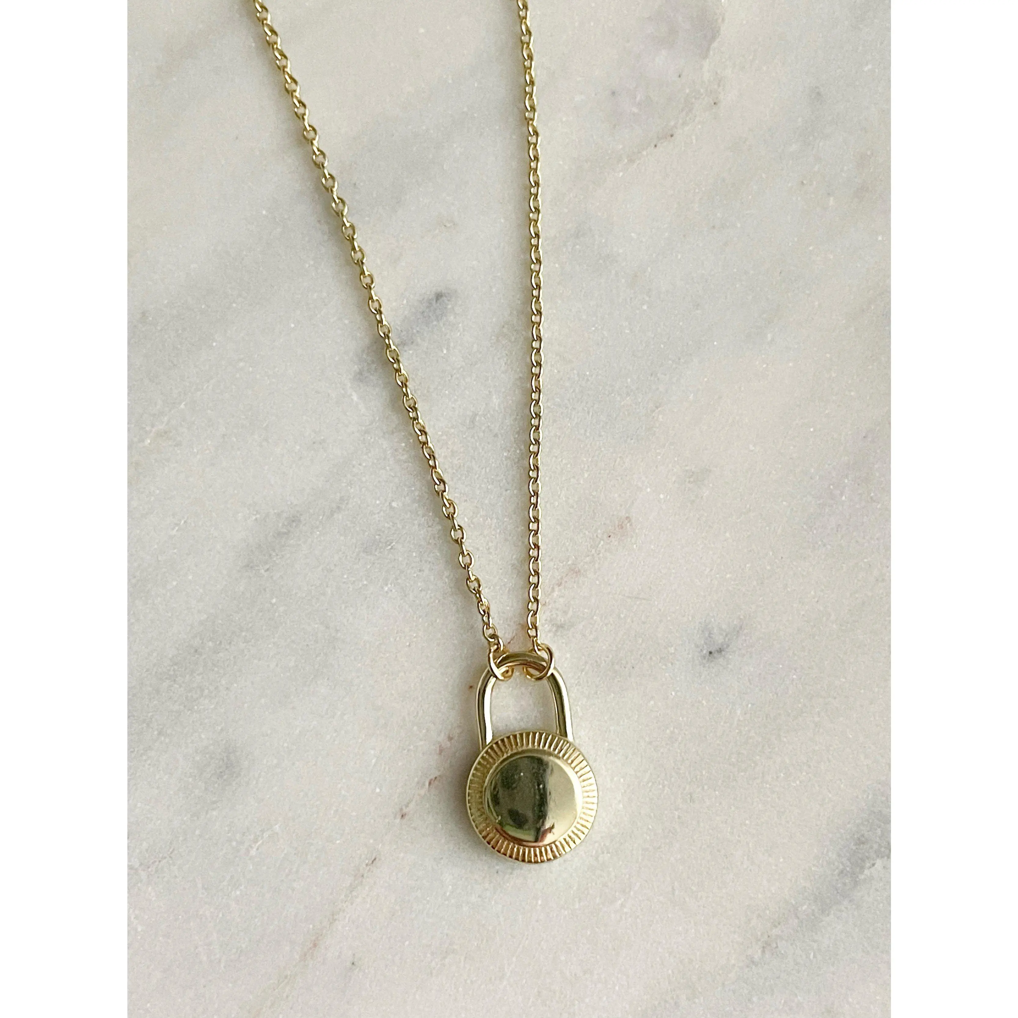 Lock up your style with this necklace. Gold circular lock pendant on a dainty cable chain.