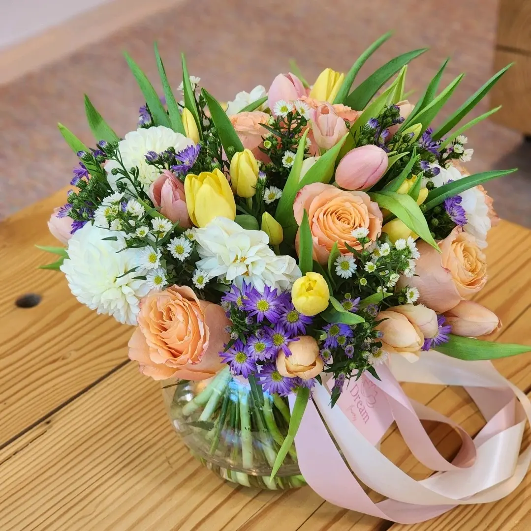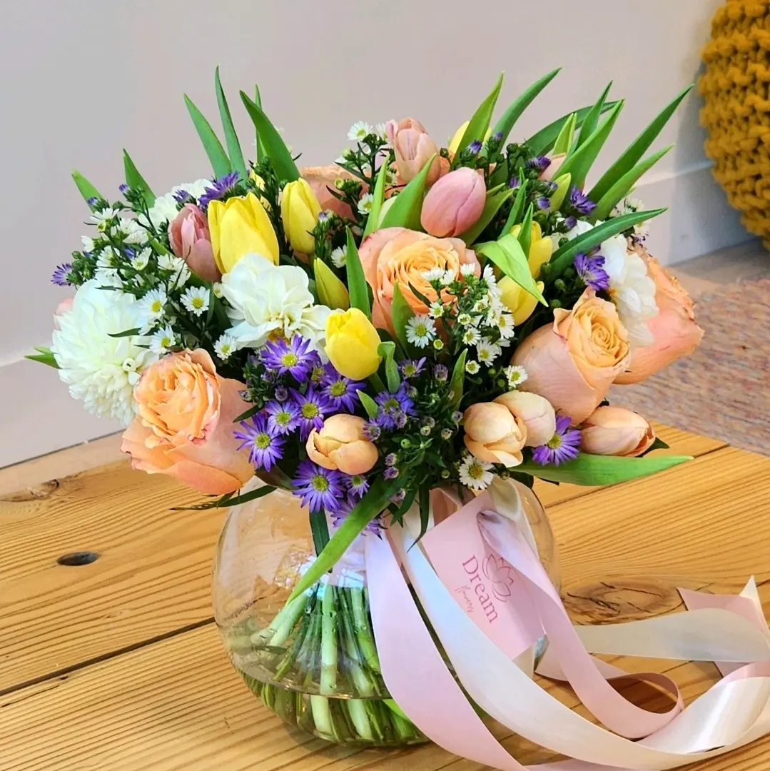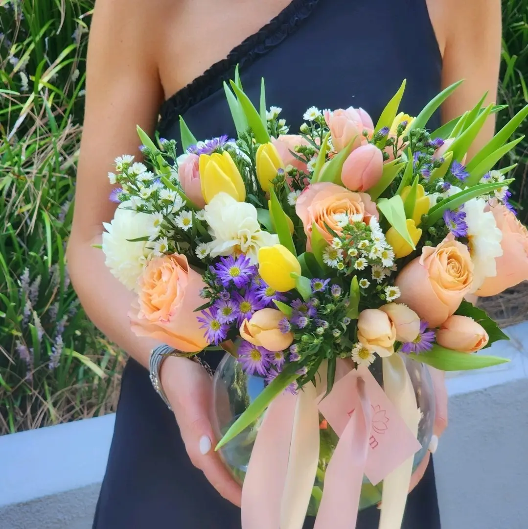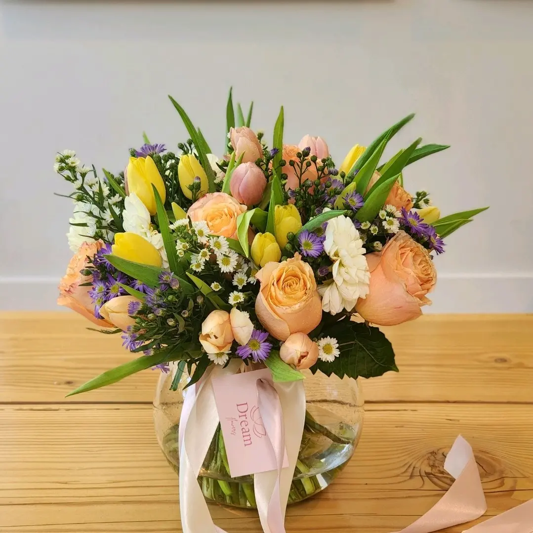A clear vase arrangement featuring peach roses, yellow tulips, white dahlias, and mix flowers. Summer floral display is perfect for any occasion. Fresh, stunning, and stylishly simple. ALL IMAGES PROVIDED AT DELUXE PRICE
