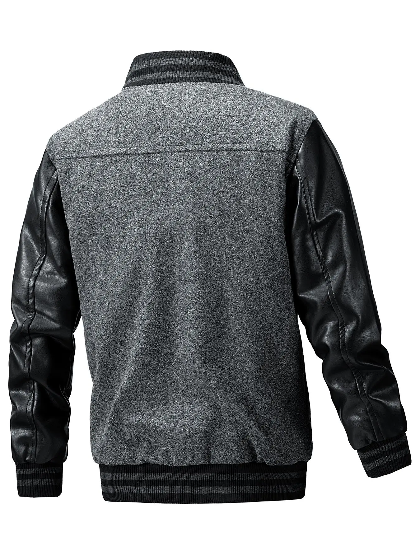 Men's Letter Embroidery Pocket PU Leather Baseball Jacket, Loose Preppy Casual Aesthetic Style Long Sleeve Button Front Outerwear for Fall & Winter, Men's Clothes for Daily Wear