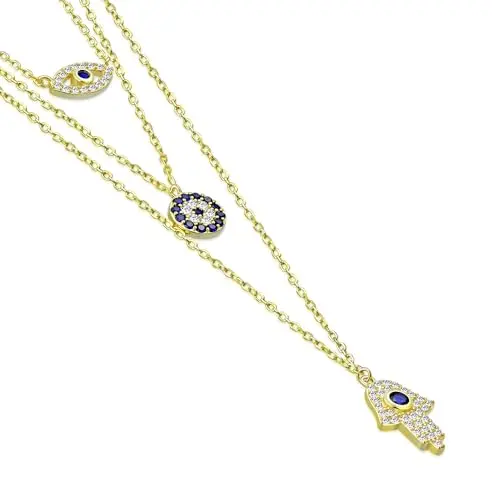 My Daily Styles 925 Sterling Silver CZ Layered Y Necklace with Hamsa, Evil Eye, and Round Eye Charms - Adjustable Chain