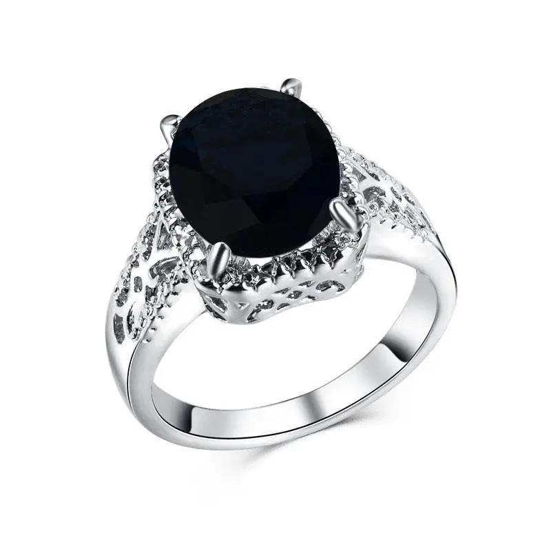 Hollow Out Oval Black Onyx Sterling Silver Ring Emerald Cut Solitaire Ring Engagement Rings