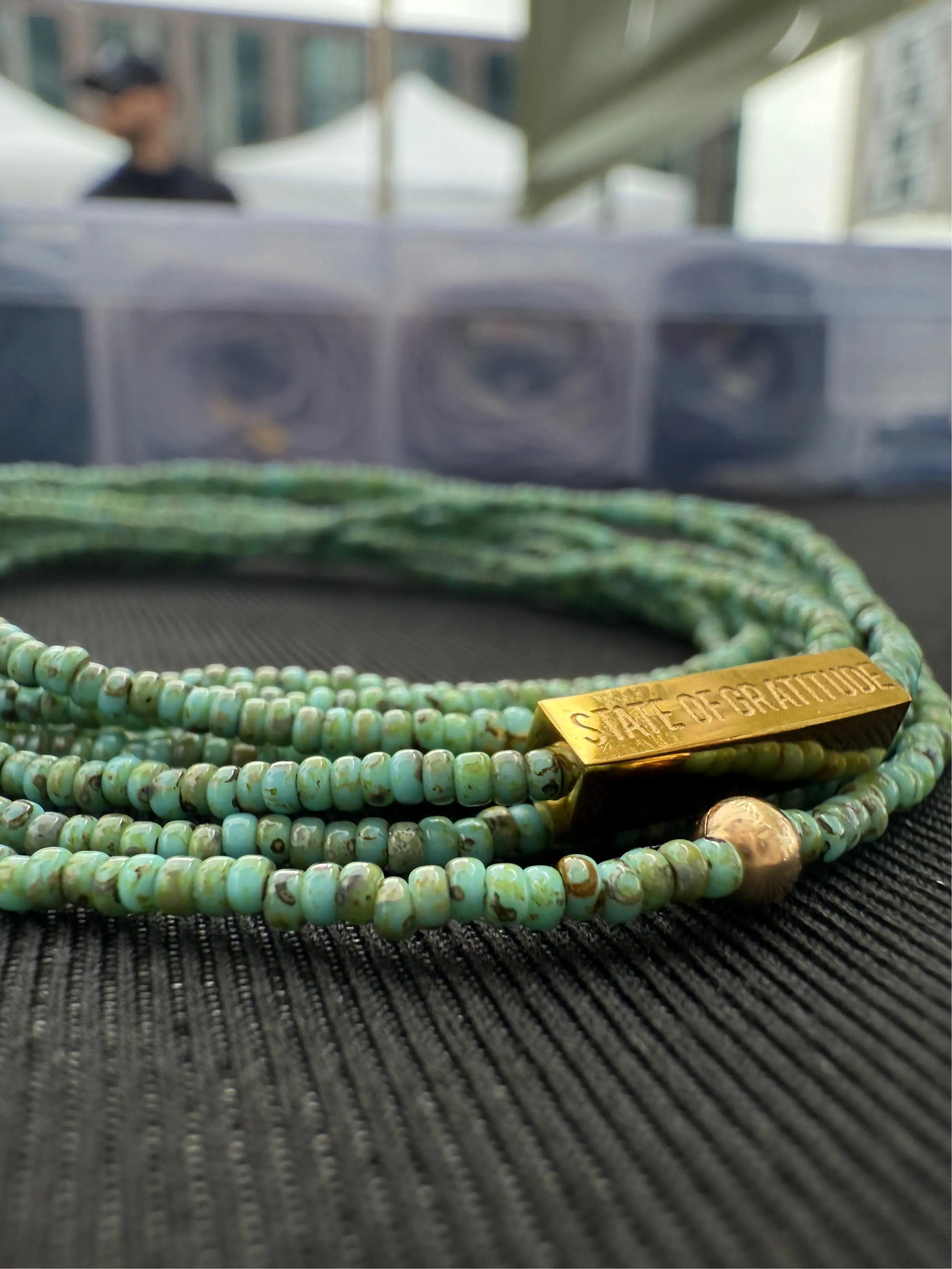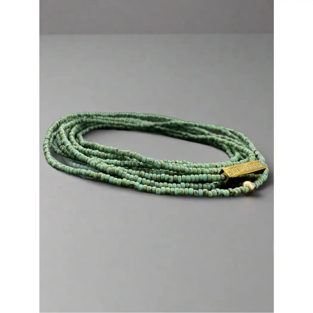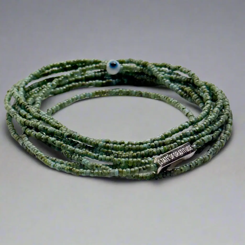 Handmade in partnership with Her 2nd Chance, this wrap of 1000 glassine beads has no beginning or end, symbolizing living in a state of gratitude. Approx. 52" long, it's decorated with 18k Gold Plated, Rose Gold, or Sterling Silver bar engraved with "State of Gratitude". These bars are plated and sealed with a polymer coating so they will not tarnish or change colors if you shower with it on, or expose it to sweat, heat, or cold.