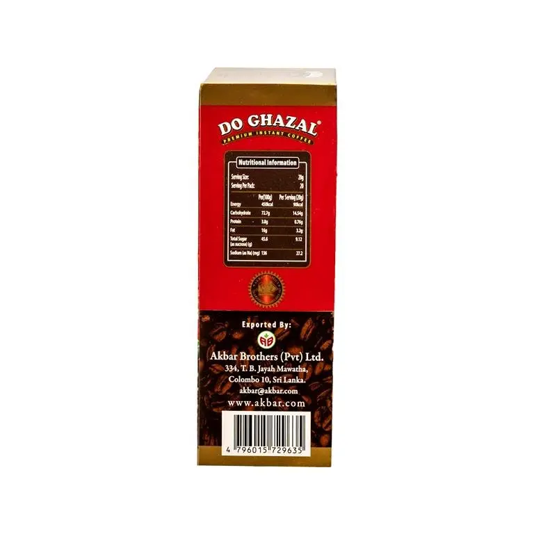 Indulge in the perfect cup of coffee with Do Ghazal 3 in 1 Premium Coffee! Each box contains 20 sachets of 20g, giving you a total of 400g of deliciousness. Enjoy the convenience of a 3 in 1 blend without sacrificing taste. (Caffeine lovers rejoice!)
