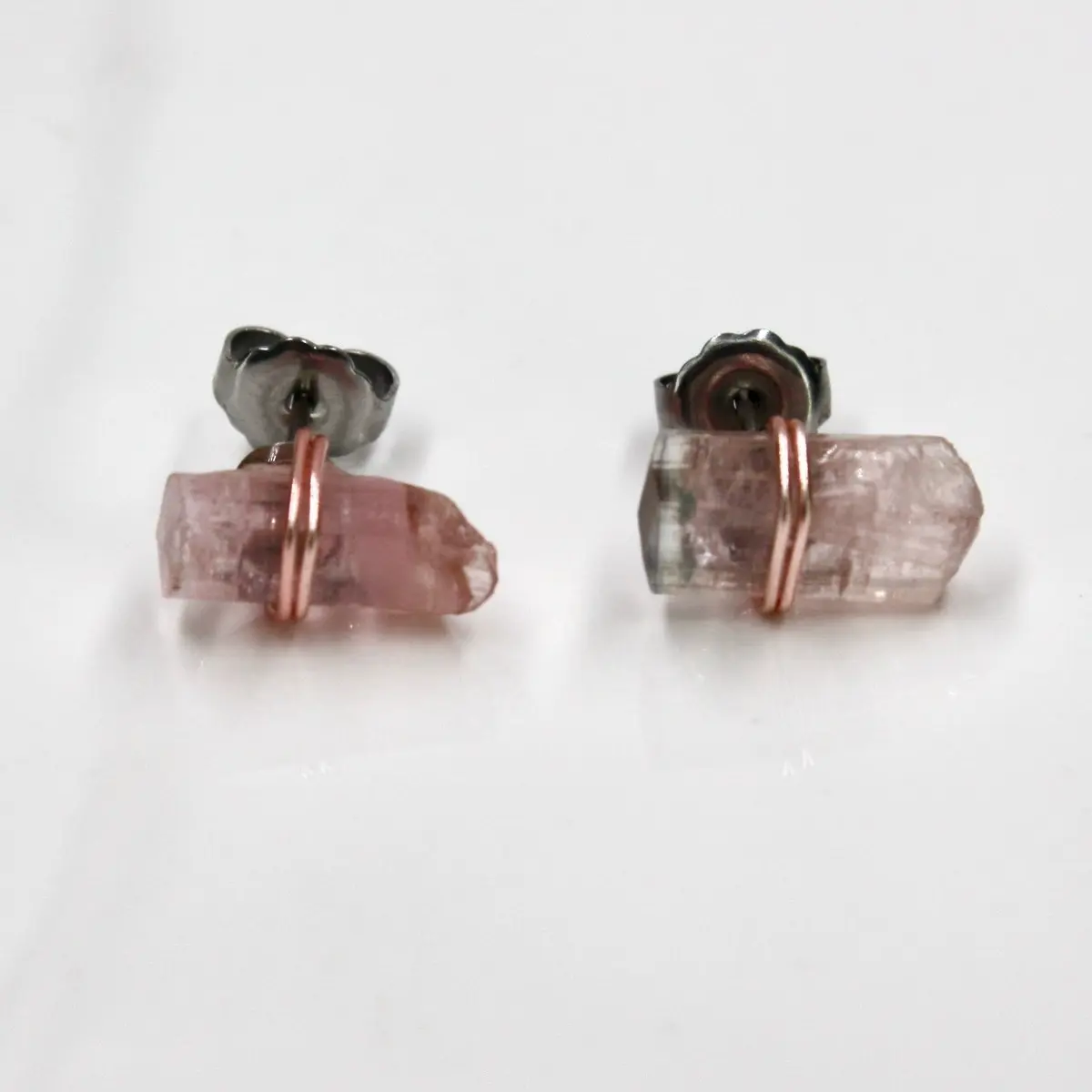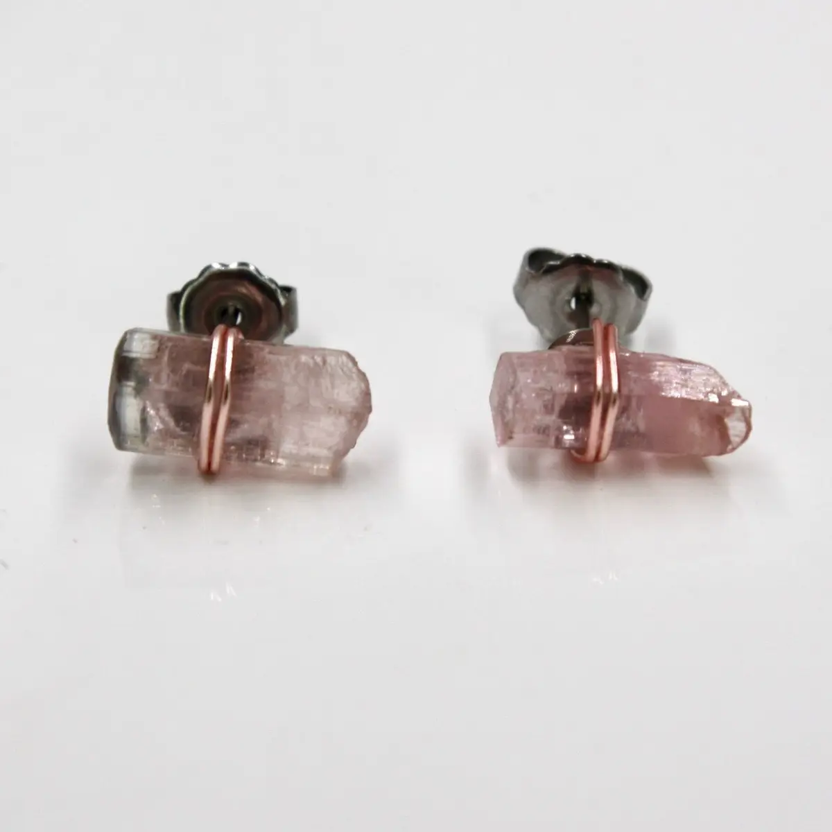 Pink Tourmaline stud earring wire wrapped in rose gold plated wire on titanium posts
