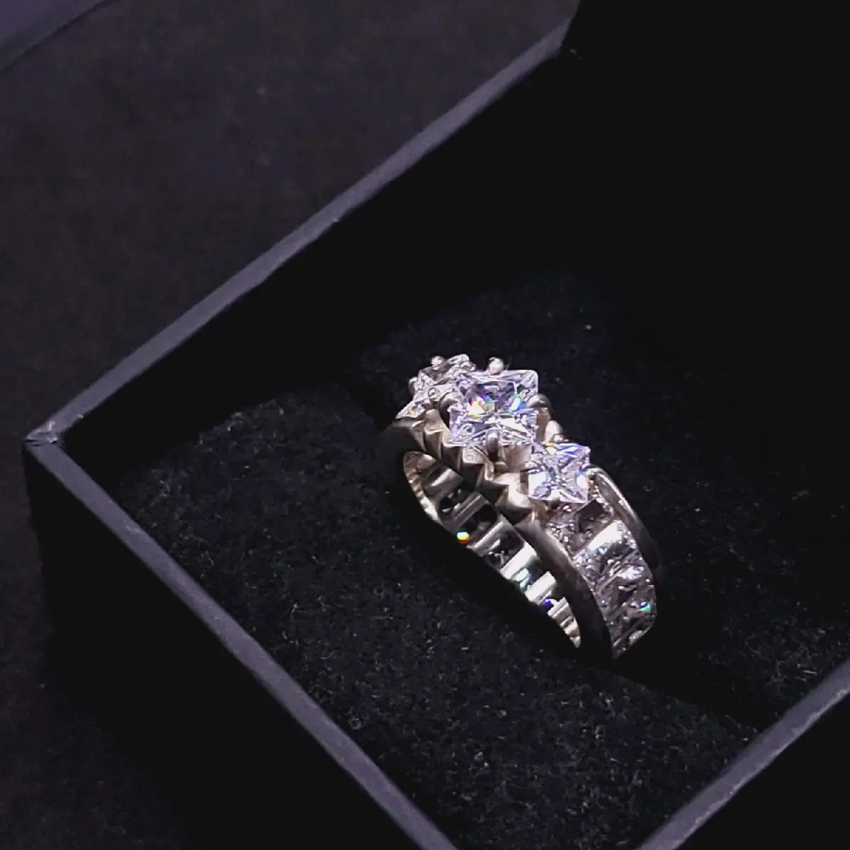 Make a grand statement of love with our Princess Cut Engagement Ring, exclusively crafted by Romani. This exquisite ring is sure to catch everyone's attention with its undeniable beauty and radiance. The ring is topped with a 6x6 princess cut cubic zirconia, complemented by two 4x4 princess cut cubic zirconia, and encircled by eighteen 5x3 emerald radiant cut cubic zirconia stones.