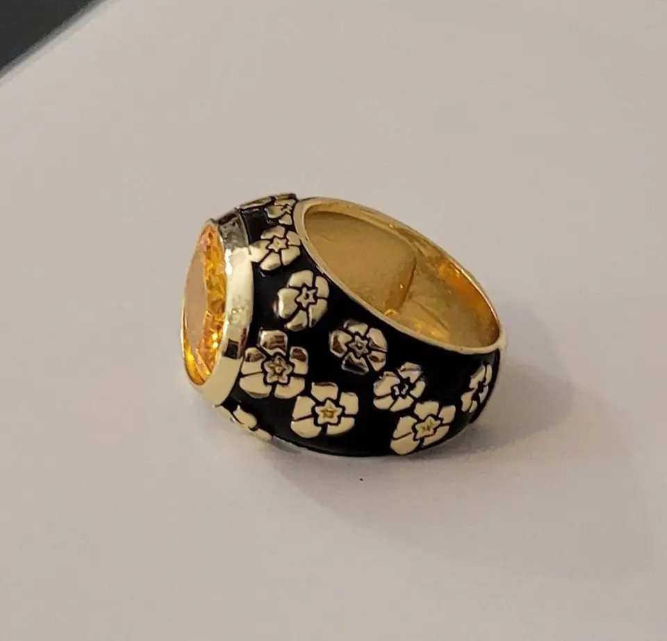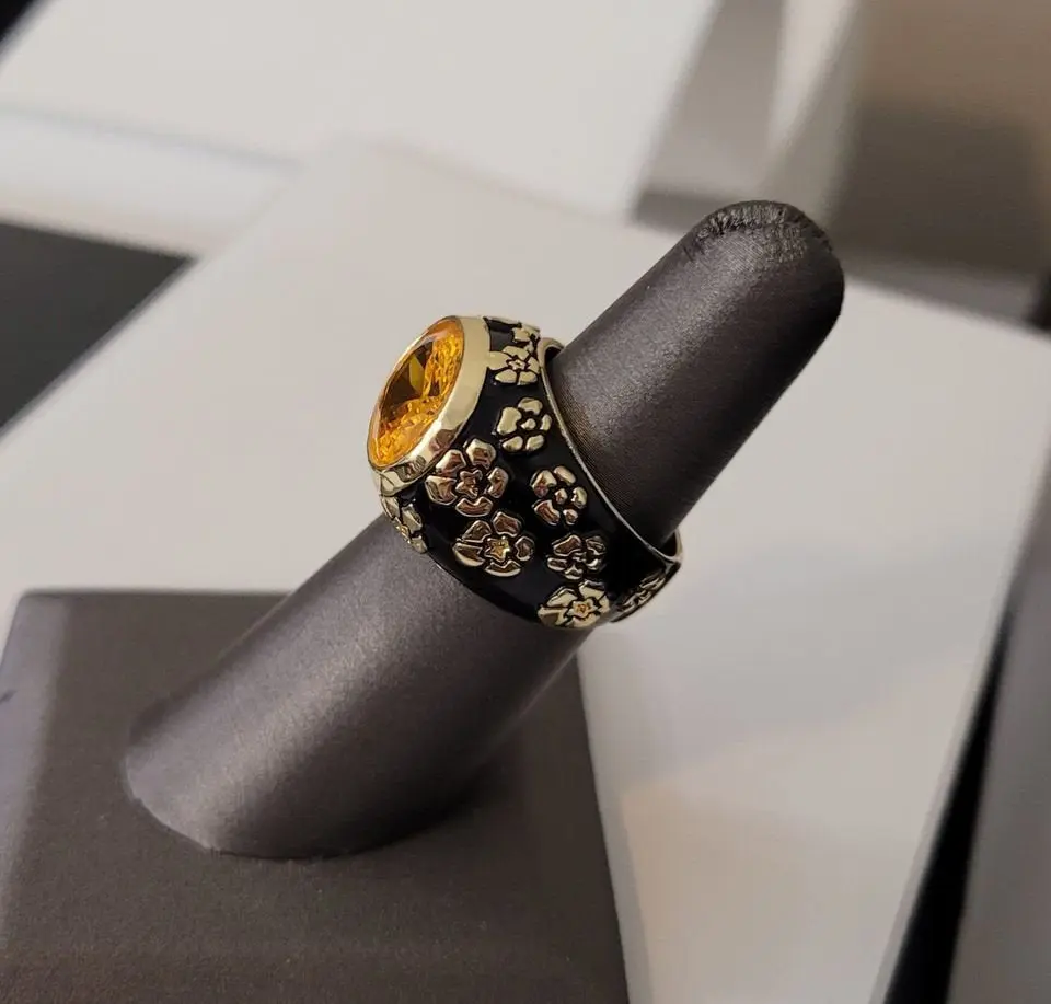 925 Sterling Silver Orange Citrine Black Enamel Flower Ring