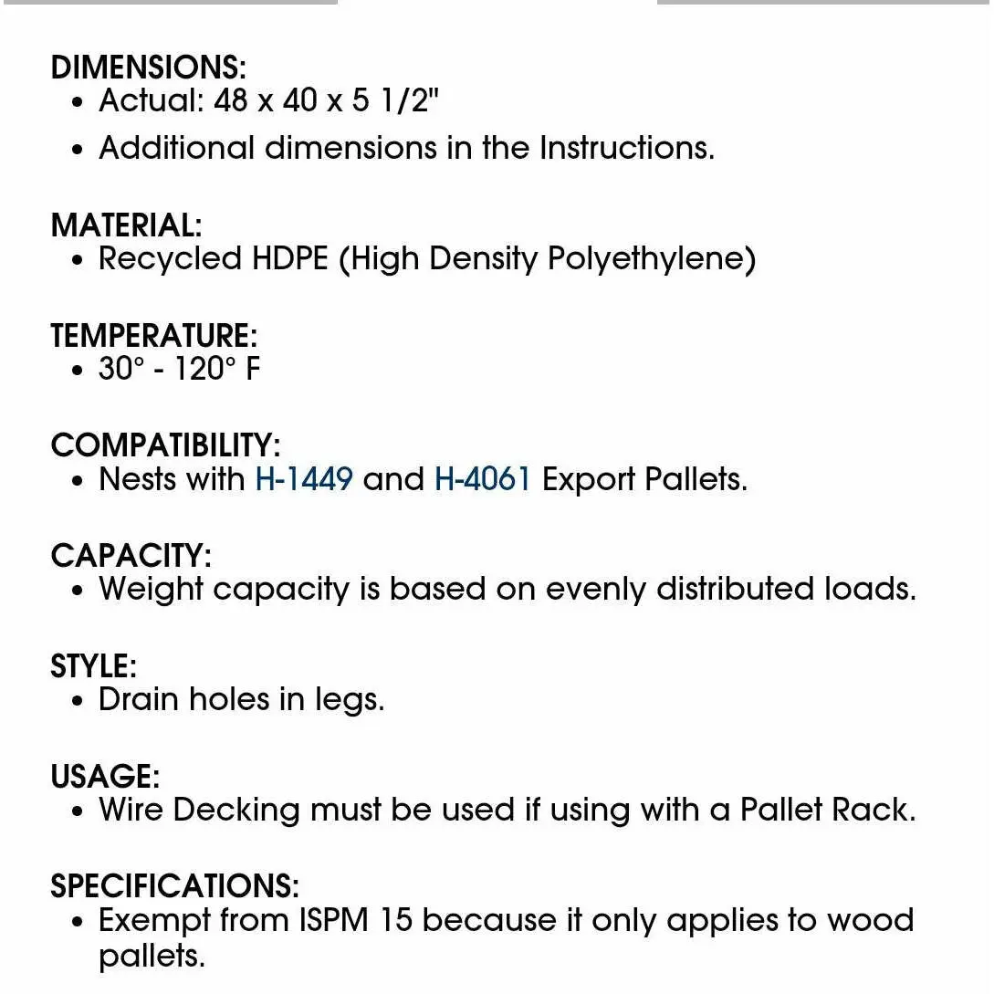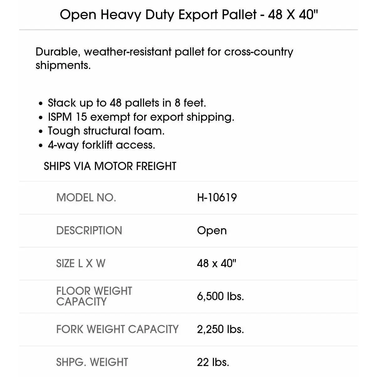 Open Heavy-duty export These export Pallets are ideal for shipping large or heavy items. Their size of 48x40 makes loading and unloading more efficient, and their sturdy construction ensures safe transportation. Reduce damage and increase productivity with these quality pallets designed for heavy-duty use.