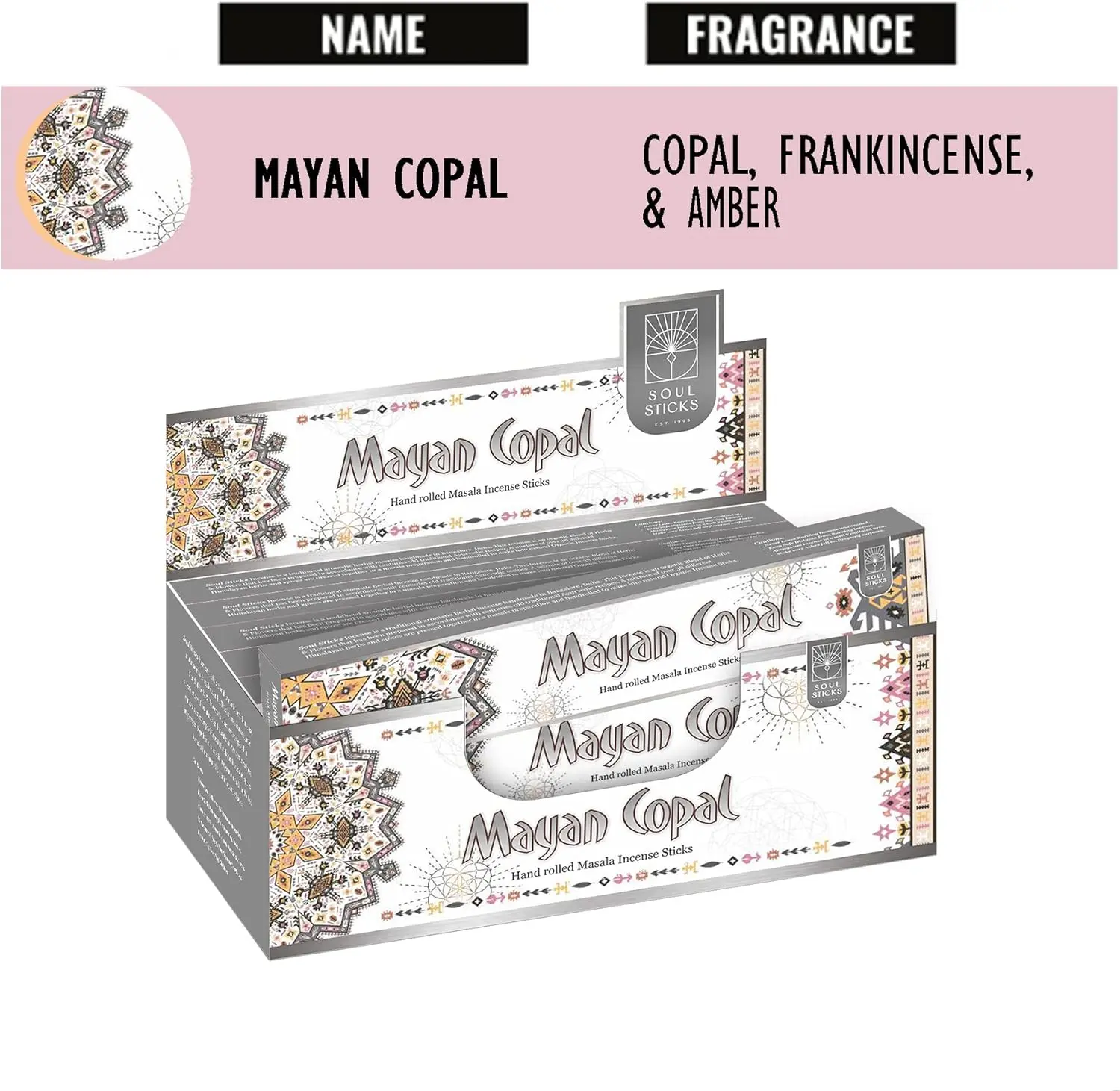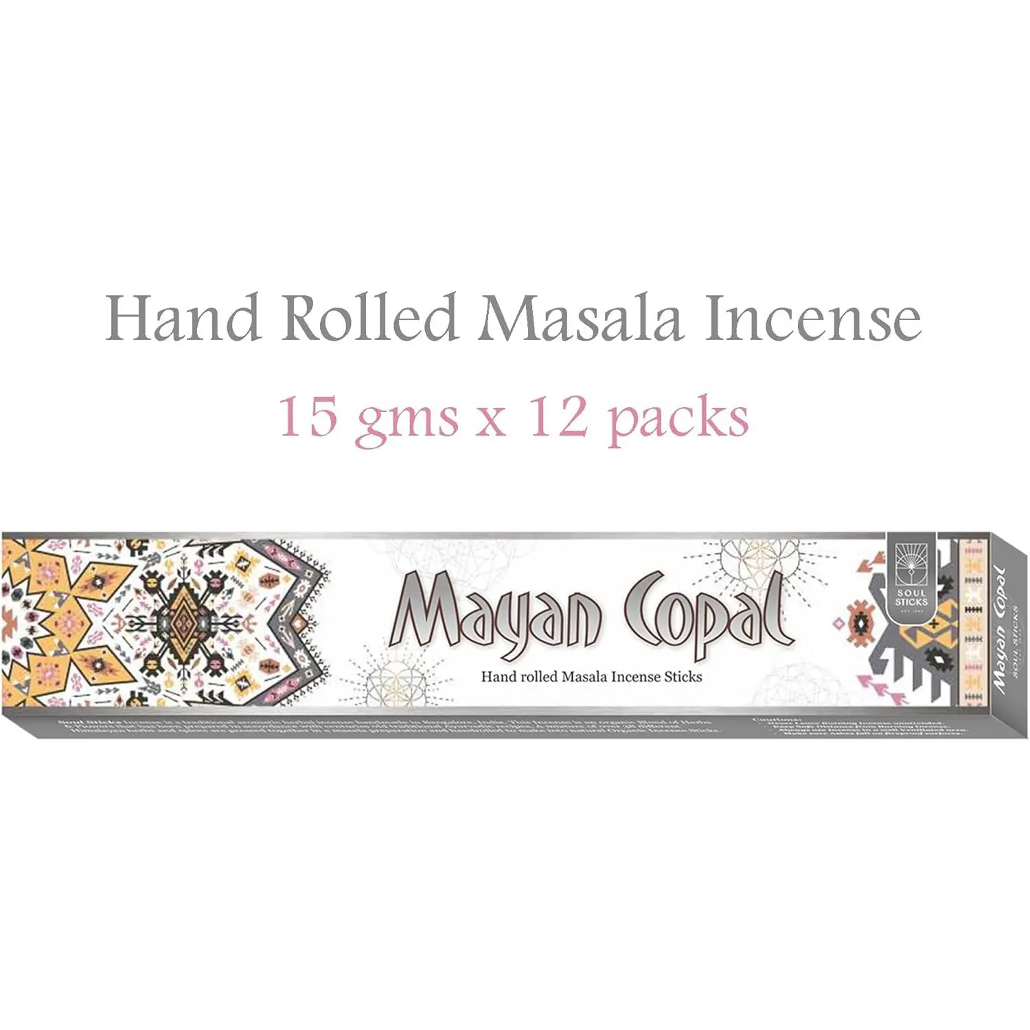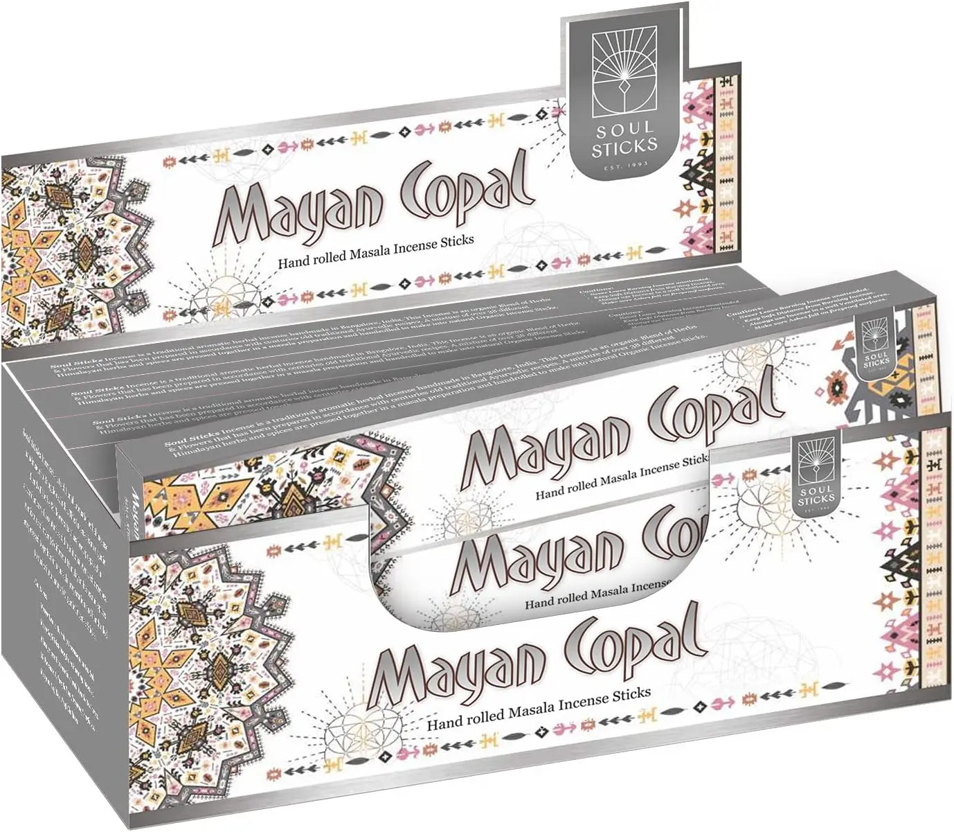 Soul Sticks Mayan Copal Masala Incense Sticks are a 12-pack of 15 g incense boxes made for meditation, home fragrance, and daily ritual use. Hand-rolled in India with a natural masala blend of herbs, spices, and flowers, they bring a warm, intentional atmosphere to your space.