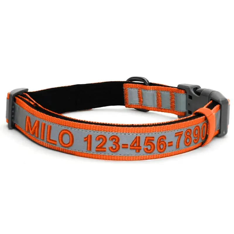 Easily identify your dogs with our Personalized Classic Padded Dog Collar is the ideal accessory for your pet! With a fully adjustable fit, a D-ring for your chosen Pawtitas leash, and a plastic ring for ID tags, and charms. You can personalize this dog collar with your dog's name and your phone number and even select different thread colors to match your dog's unique style. Its reflective properties also provide increased visibility in low light conditions, giving you peace of mind on walks or in the dark. Upgrade your dog's accessory game today