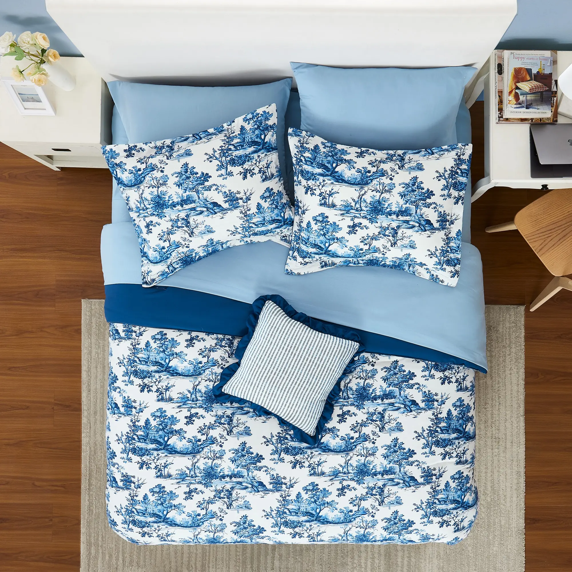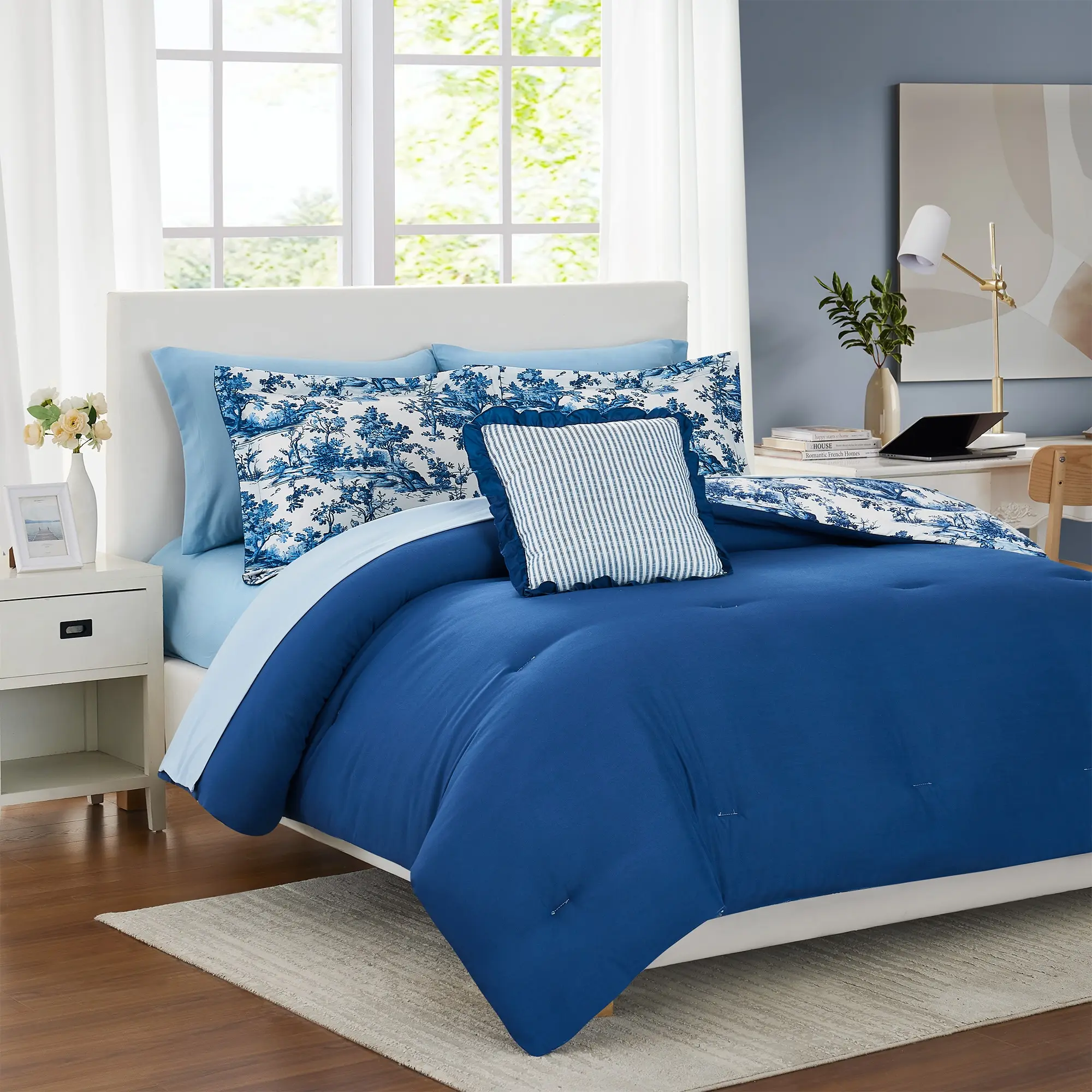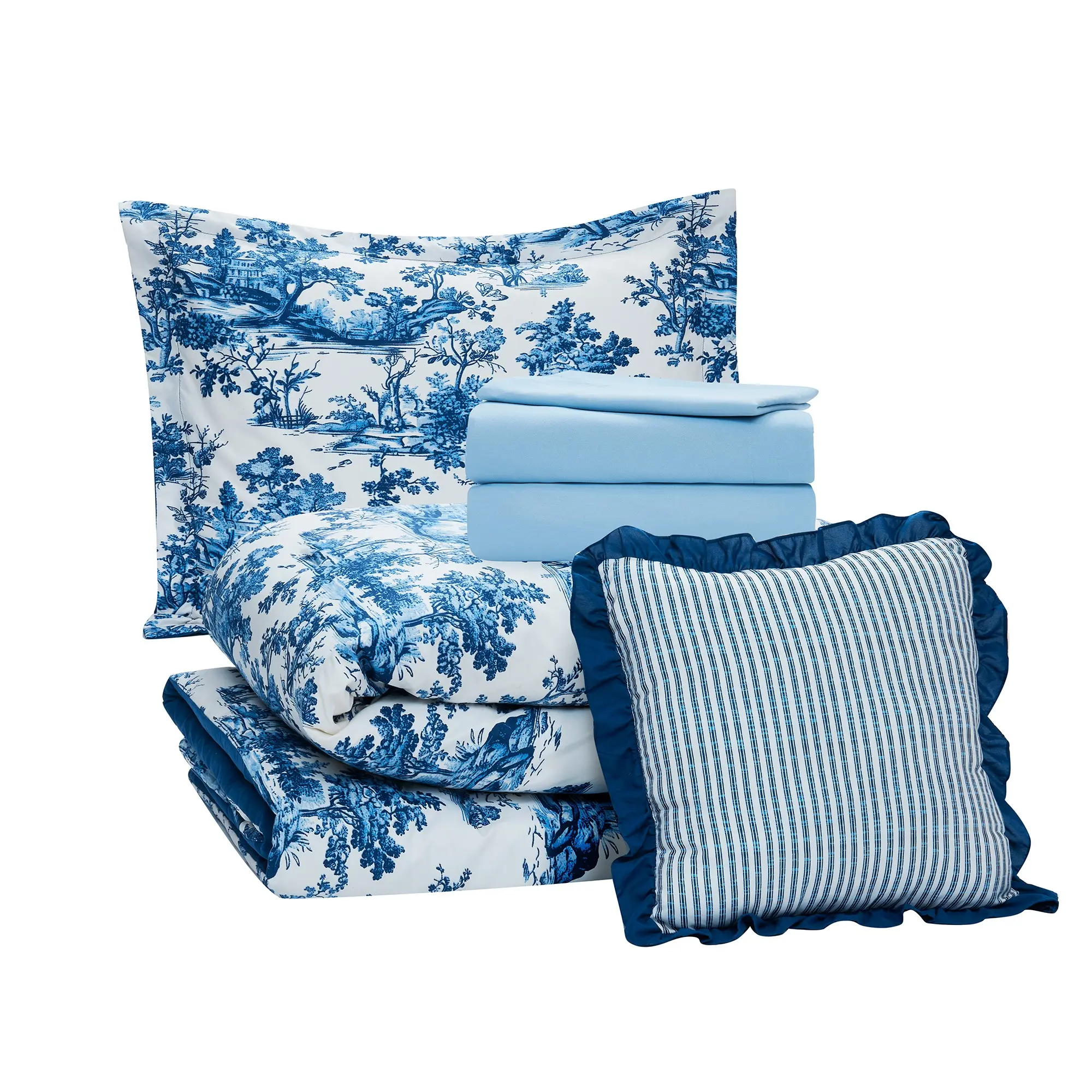 This bedding set includes a comforter, pillow shams, flat sheet, fitted sheet, pillowcases, and 1 decorative pillow. The reversible design allows for versatility in styling and can match different room decors. The comforter provides warmth and comfort, making it perfect for colder seasons. The pillow shams add a decorative touch to the bedding and can protect the pillows from dirt and dust.