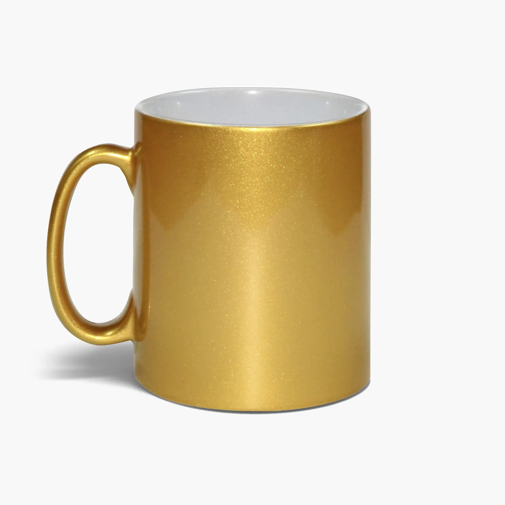 • Glossy ceramic mugs with a metallic finish.