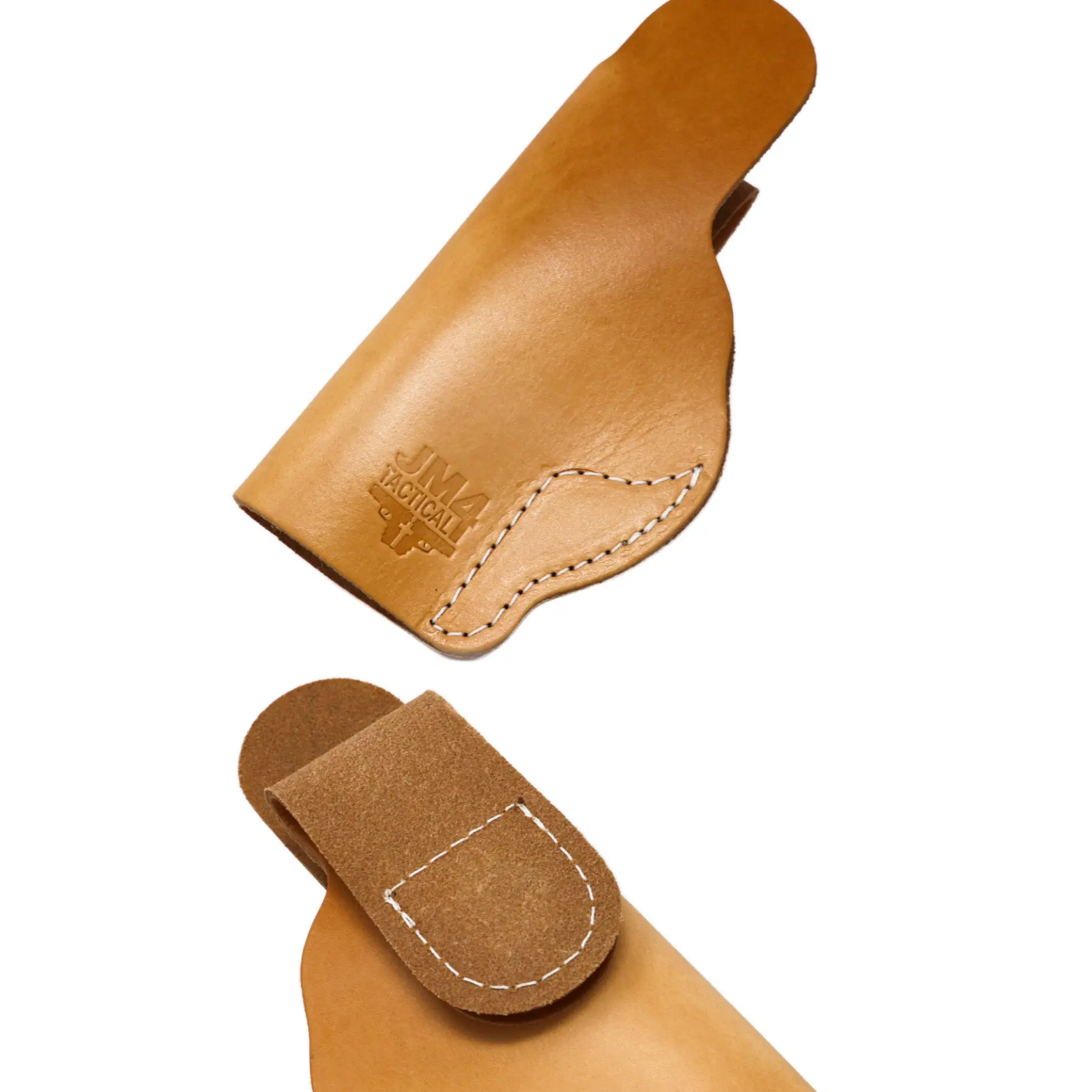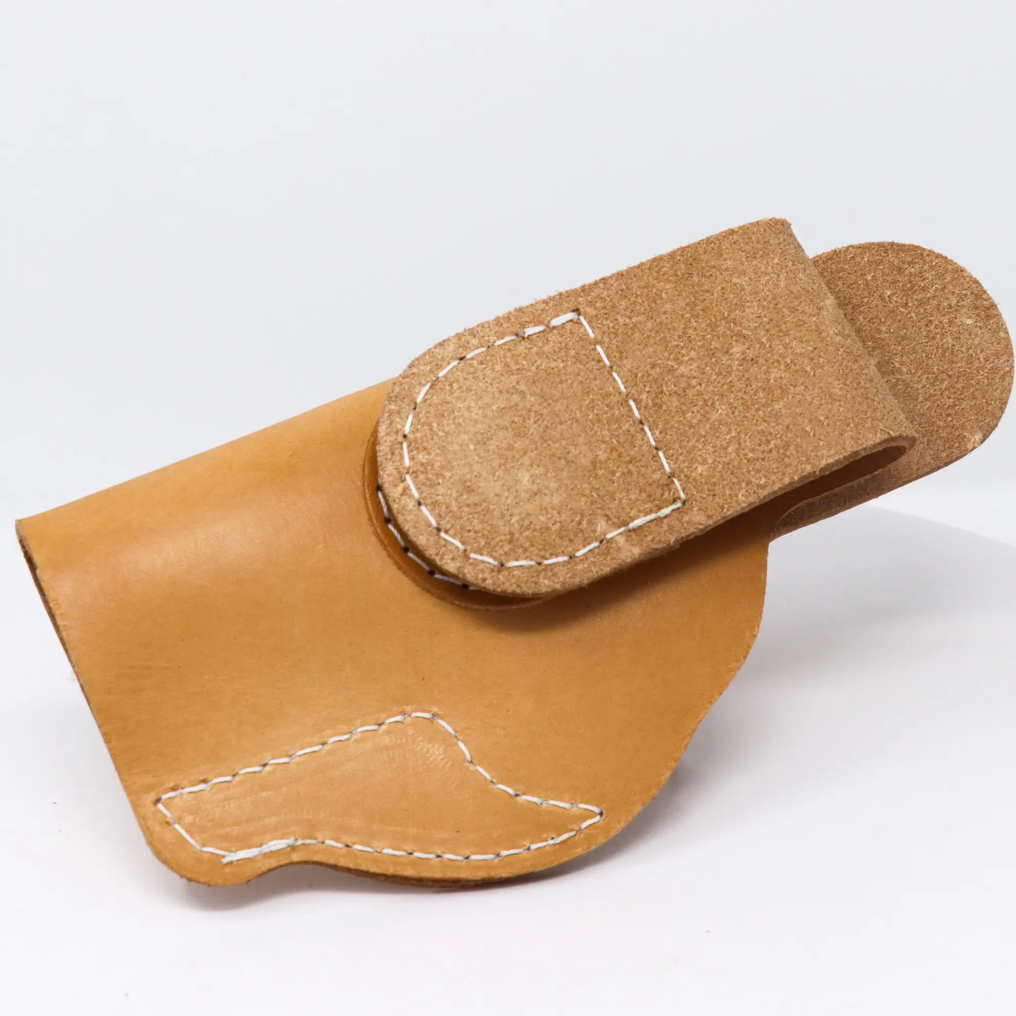 This concealed holster was designed with only one layer of leather that provides a smooth outer layer to provide comfort. The interior and strap of the holster feature the roughout leather.