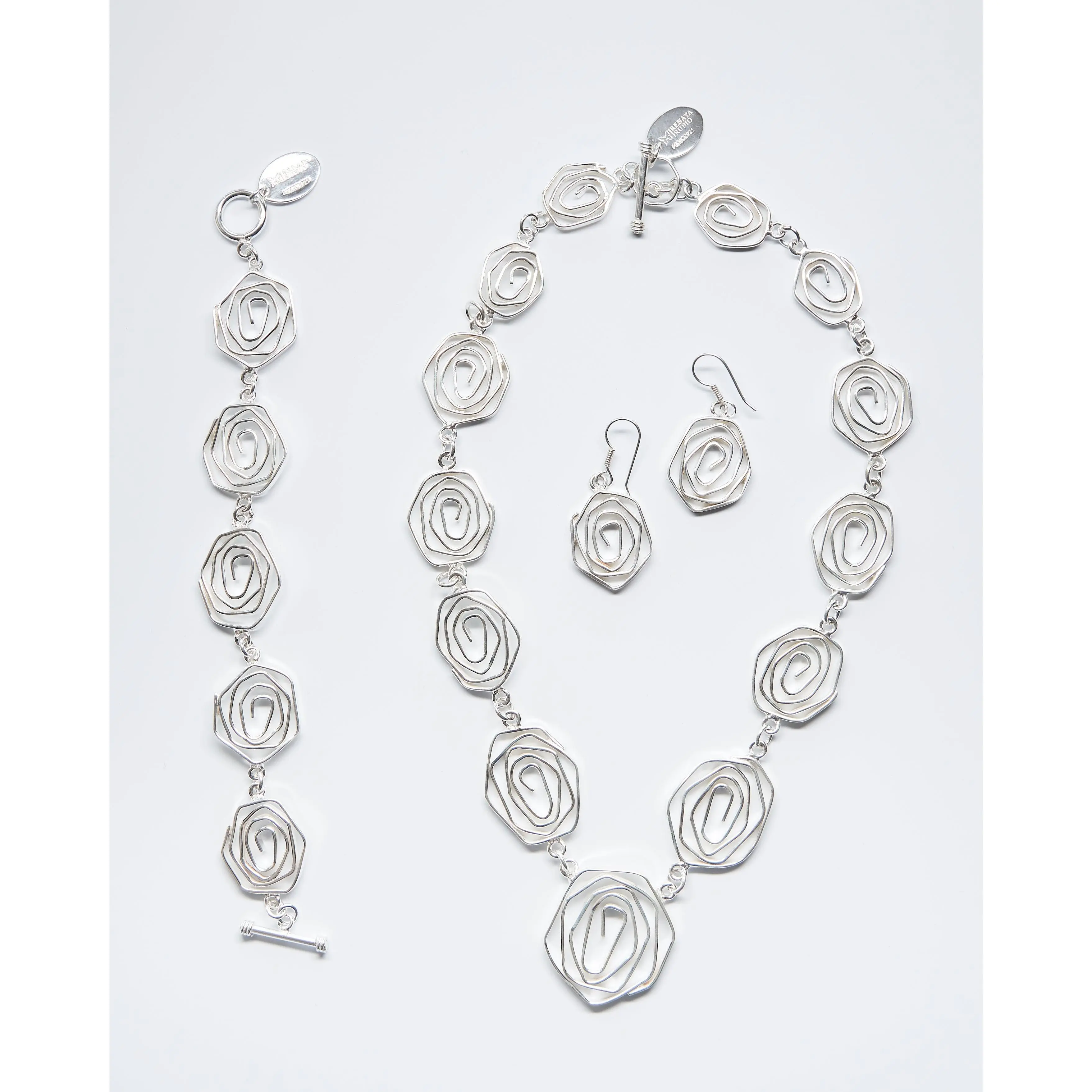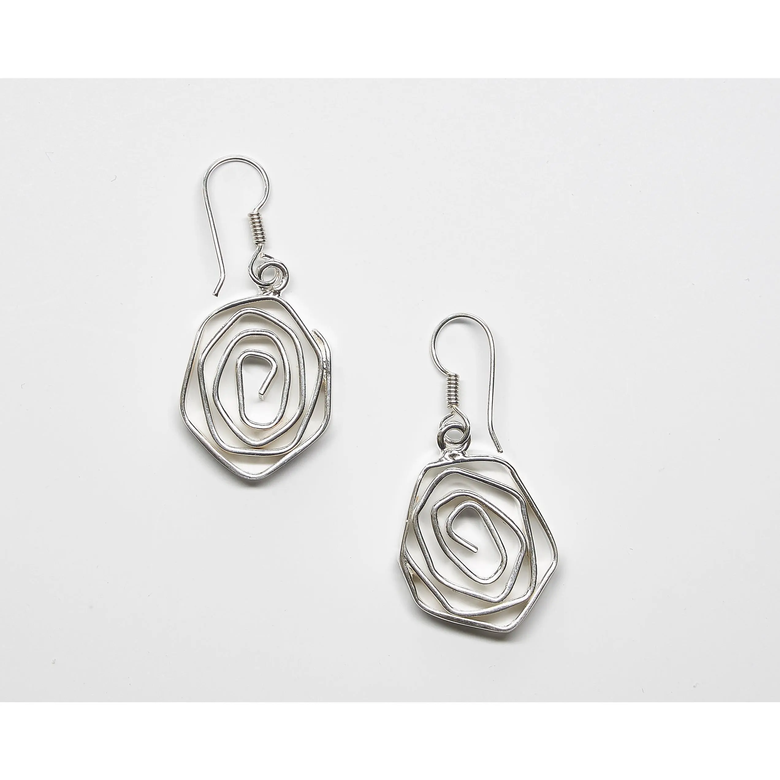 This pair of sterling silver earrings has both depth and substance, all wrapped in sophistication. Flat sterling silver wire is hand coiled to form a labyrinth. The surface of this wire has a high polish finish, while the inside of the labyrinth has a matted finish. The coiled labyrinth measures .9" tall by .8" wide.