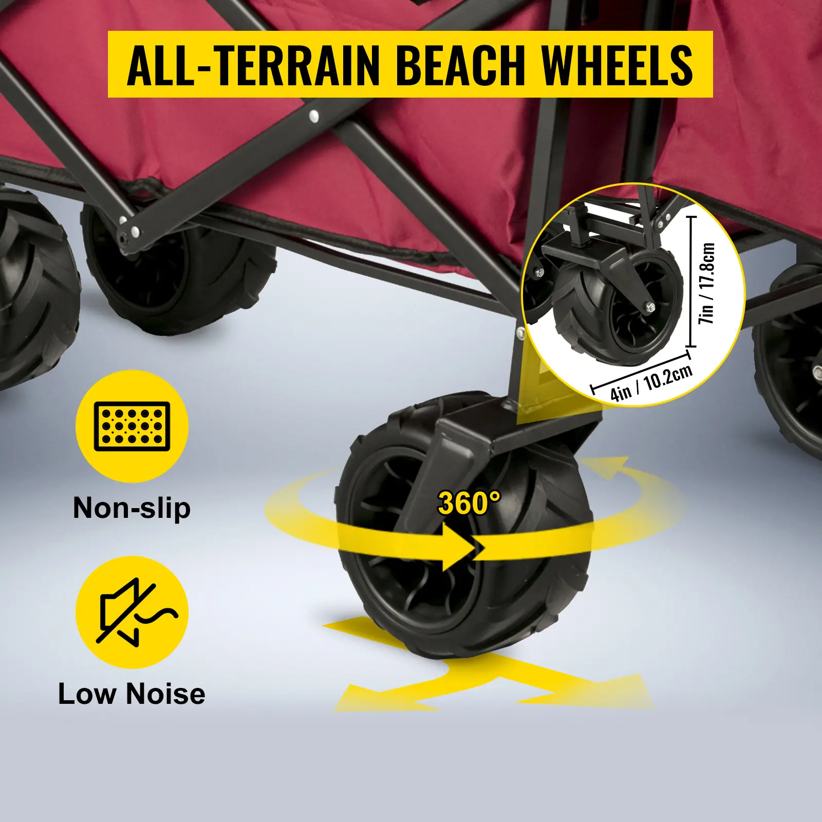 • Flexible Movement of All-terrain: The 360° universal wheels, as well as flexible handle, allows you to control the beach wagon with ease. The handle locks in place with a joint, so there's no need to worry about losing control.