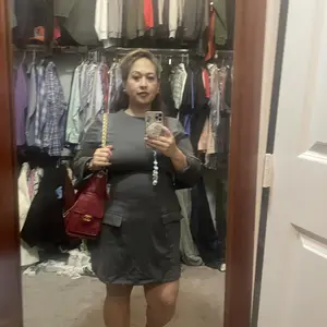 Great dress, a little short however I was wearing shorts under in the photo so the shorts made it look shorter than it actually is. The material is very thick and pretty stretchy. The sleeves are a little tight but overall very nice. The zipper is a little cheap quality.