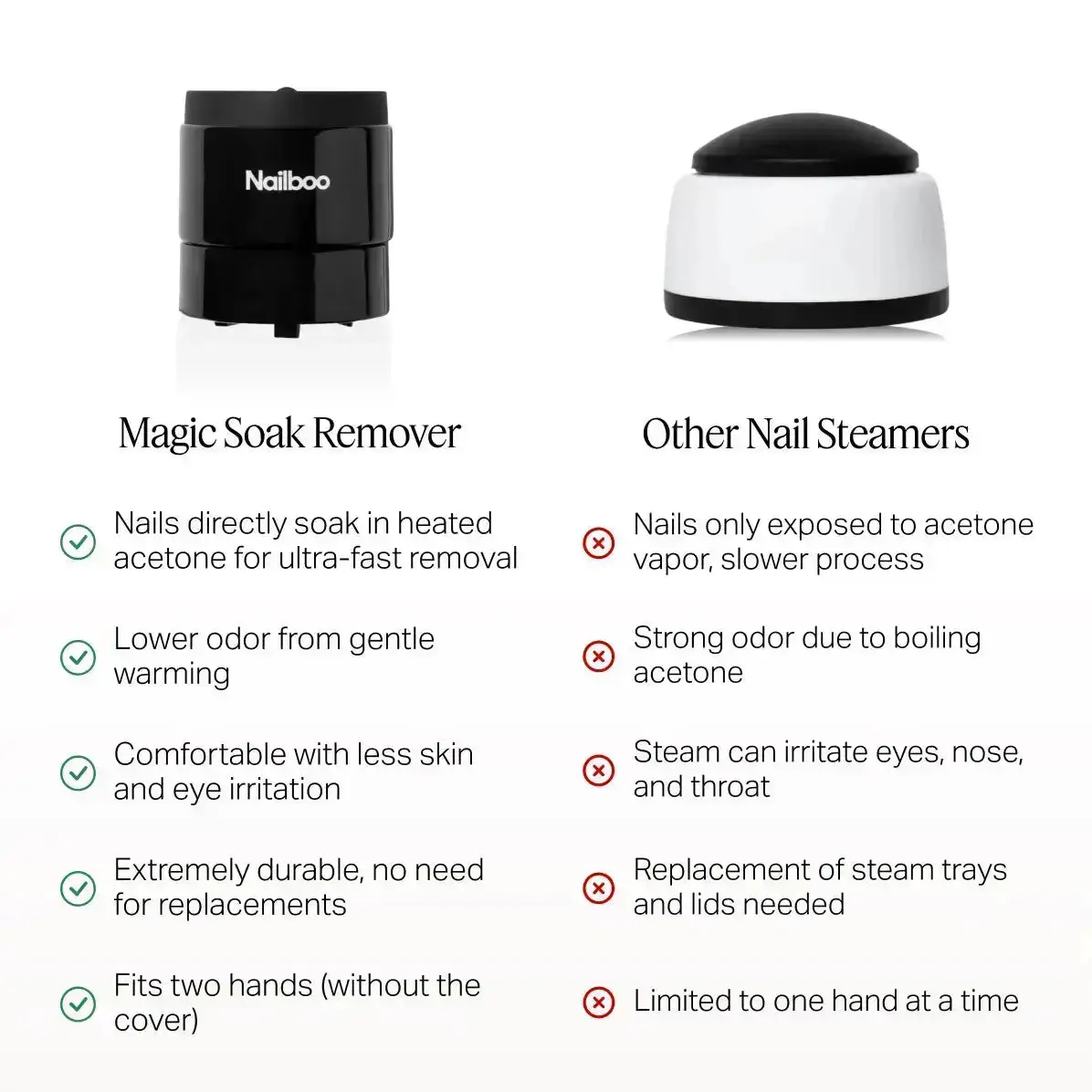 Unlike a nail steamer, the Magic Soak Manicure Remover does not boil acetone, resulting in less odor. Steamer removers generally take longer and dry out the skin more due to higher temperatures. In a steamer, your nails don't directly touch the liquid acetone only the vapours, so it takes longer to work. The Magic Soak is more efficient especially for dip removal because the dip powder is agitated by rubbing against the paper towel. The Magic Soak is also easier to clean with its separate warming base and ceramic bowl design.
