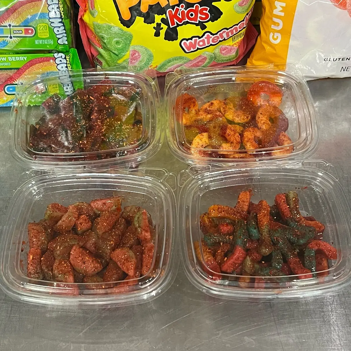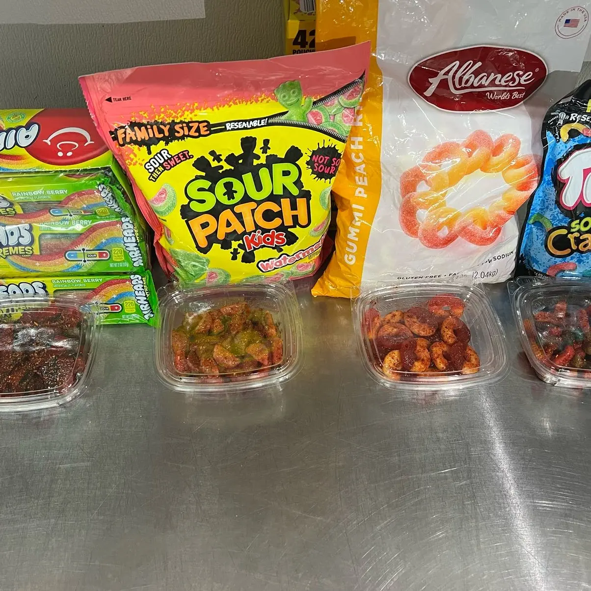 This candy mix is a must-have for anyone who loves a tangy and sweet taste. The mix includes Chamoy Tajin coated sour candy, Trolli worms, peach rings, and rainbow strips. The Chamoy Tajin coating provides a unique and tangy taste to the candy, making it a great choice for those who love a little bit of spice in their candy.
