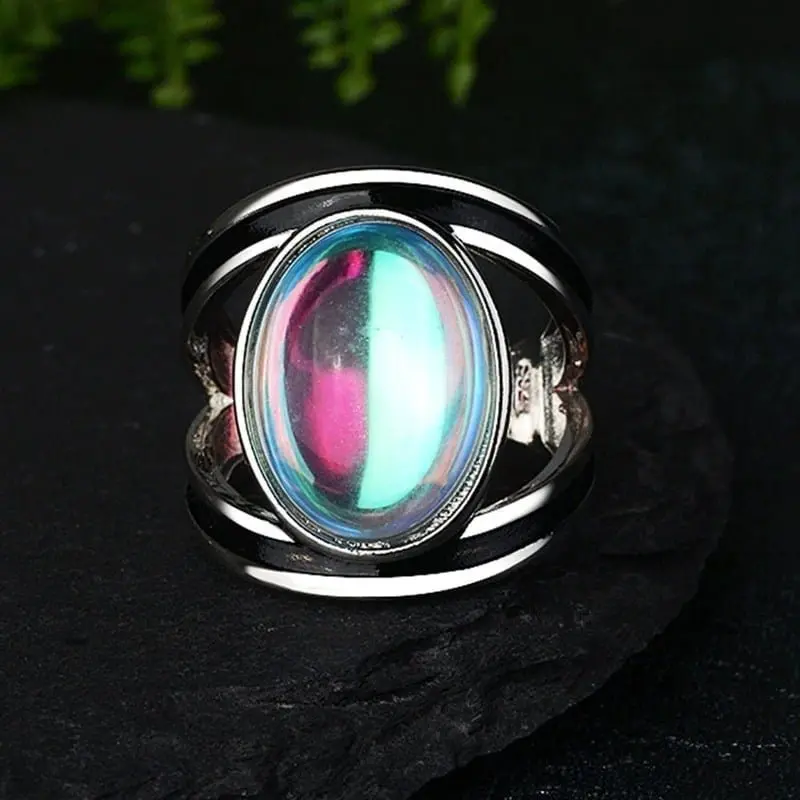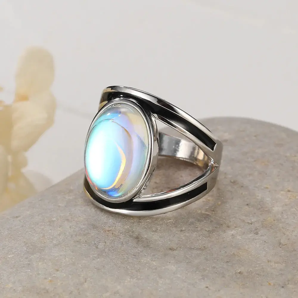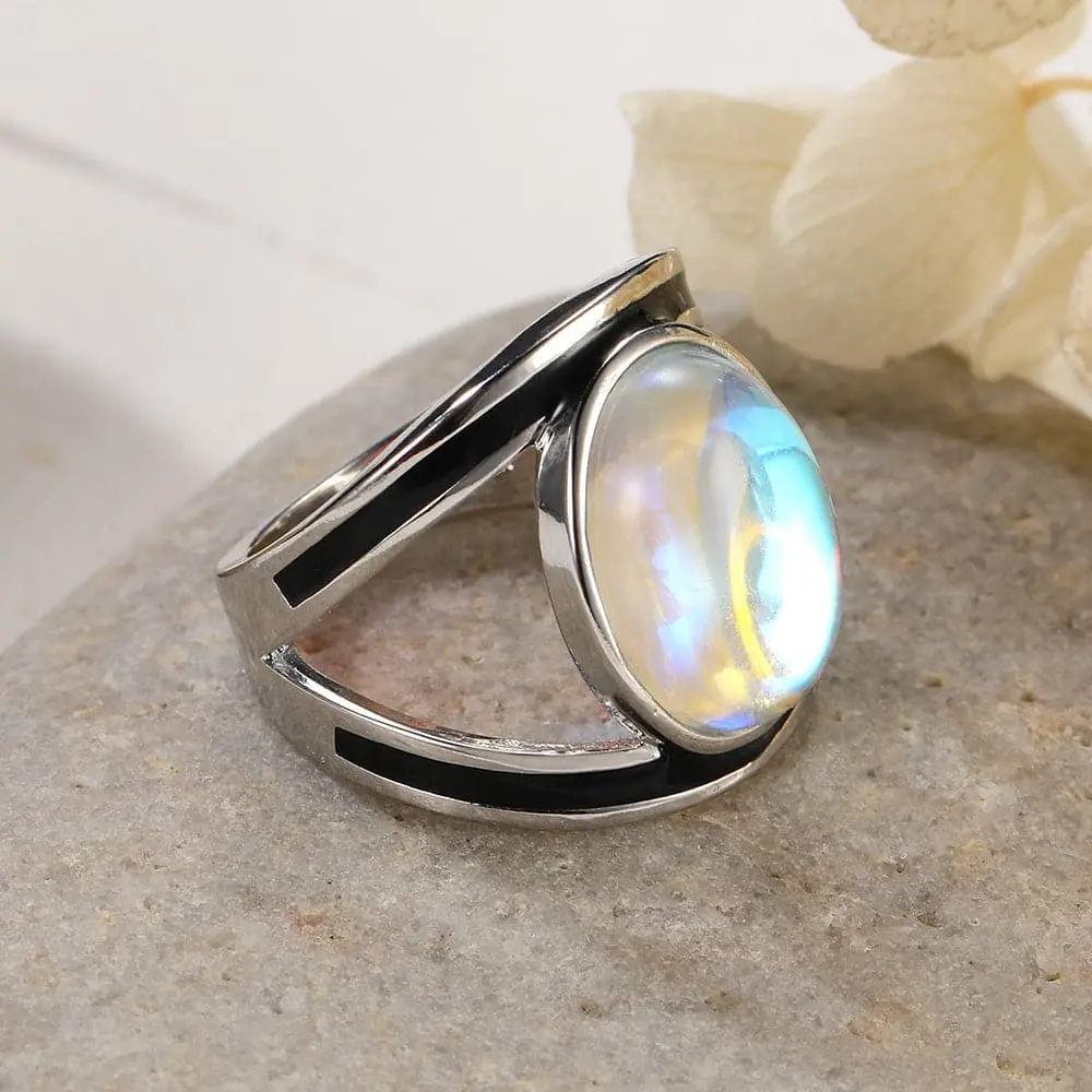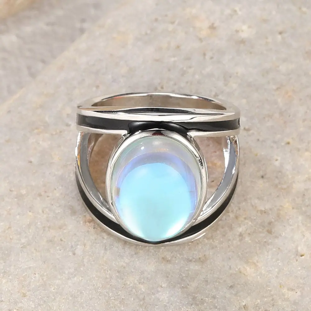 Sterling Silver Oval Multicolor Faux Moonstone Ring Solitaire Engagement Rings Geometric Design Ring