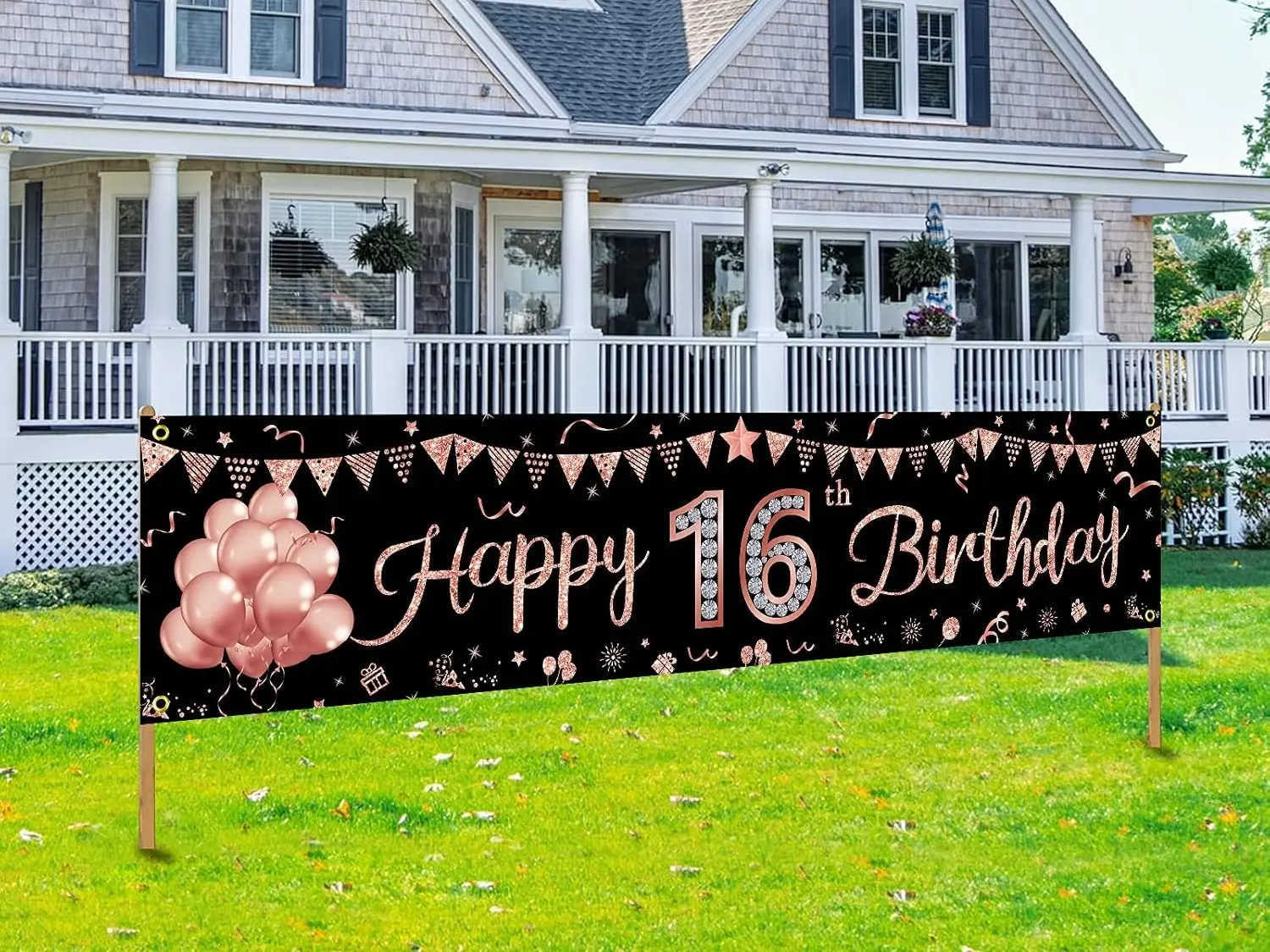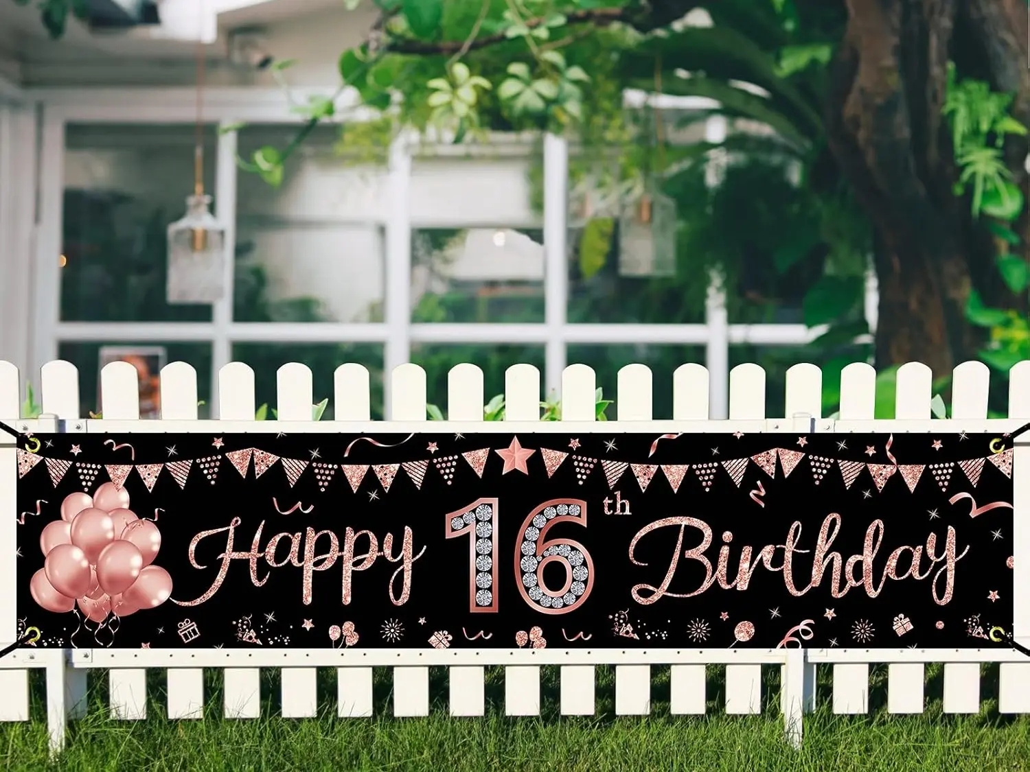 Make your sweet 16 celebration extra special with this Happy 16th Birthday Banner in elegant rose gold!
