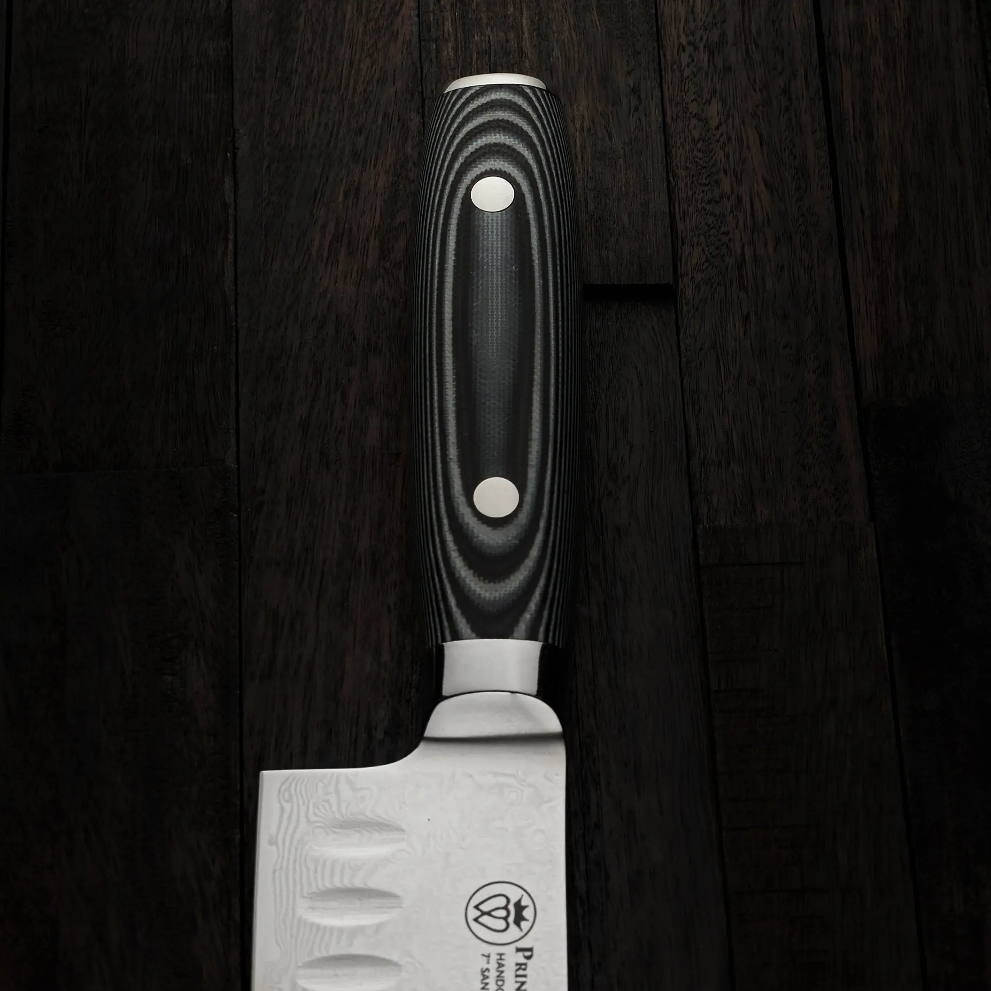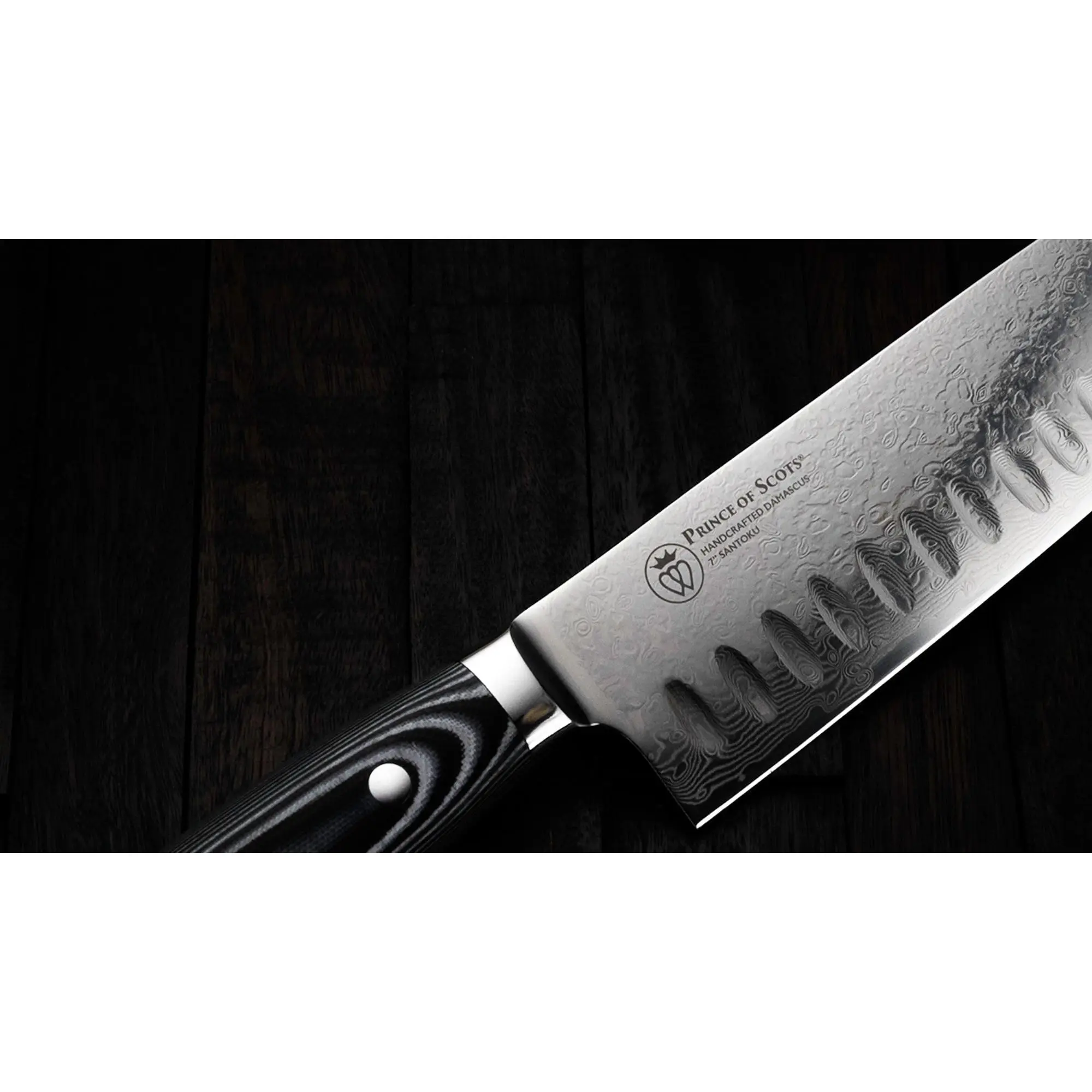 Prince of Scots Damascus knives reflect the craftsmanship of a centuries-old tradition of Japanese knife making merged with American Design and Engineering. The fusion of Eastern and Western knifemaking philosophies feature increased knuckle clearance for home kitchen use.