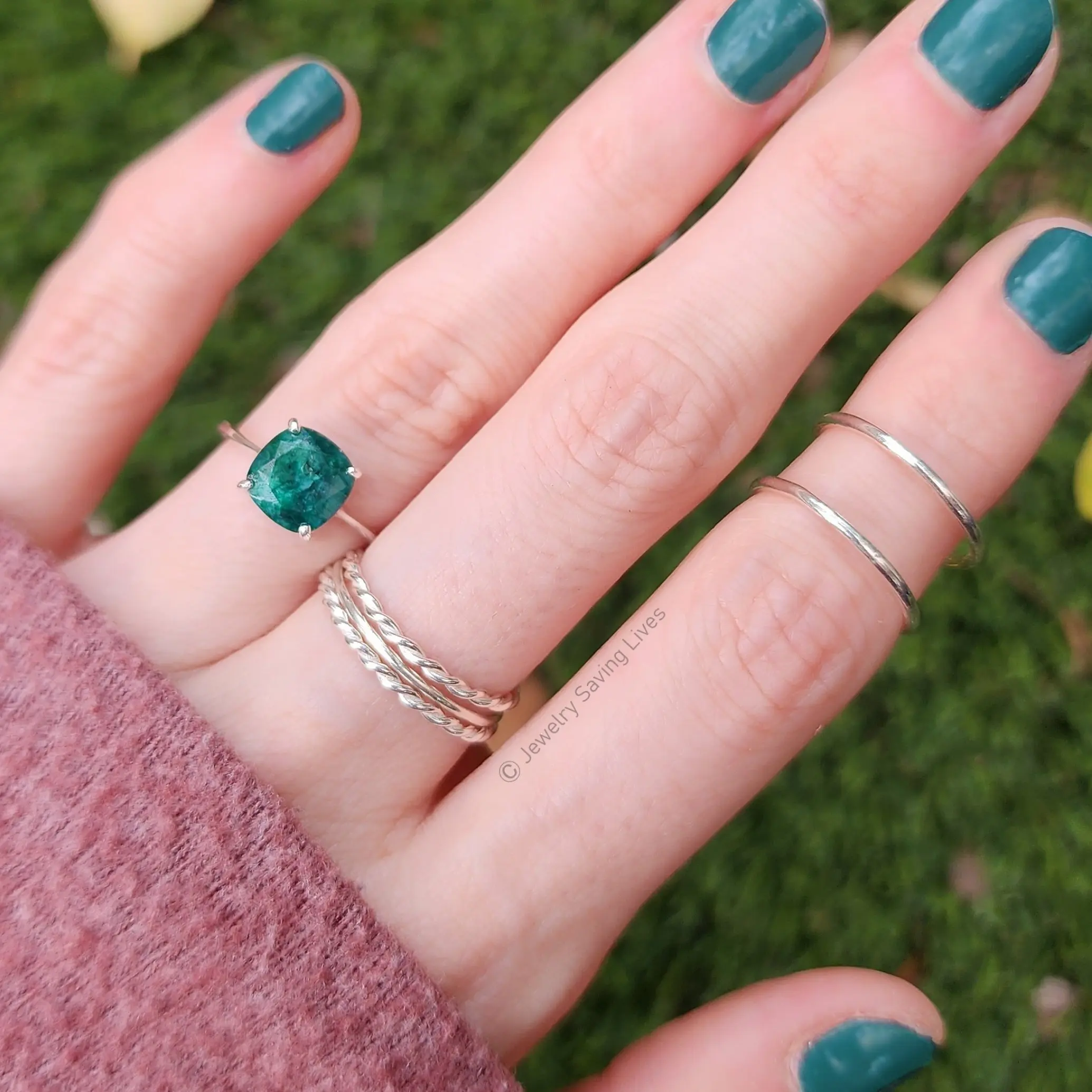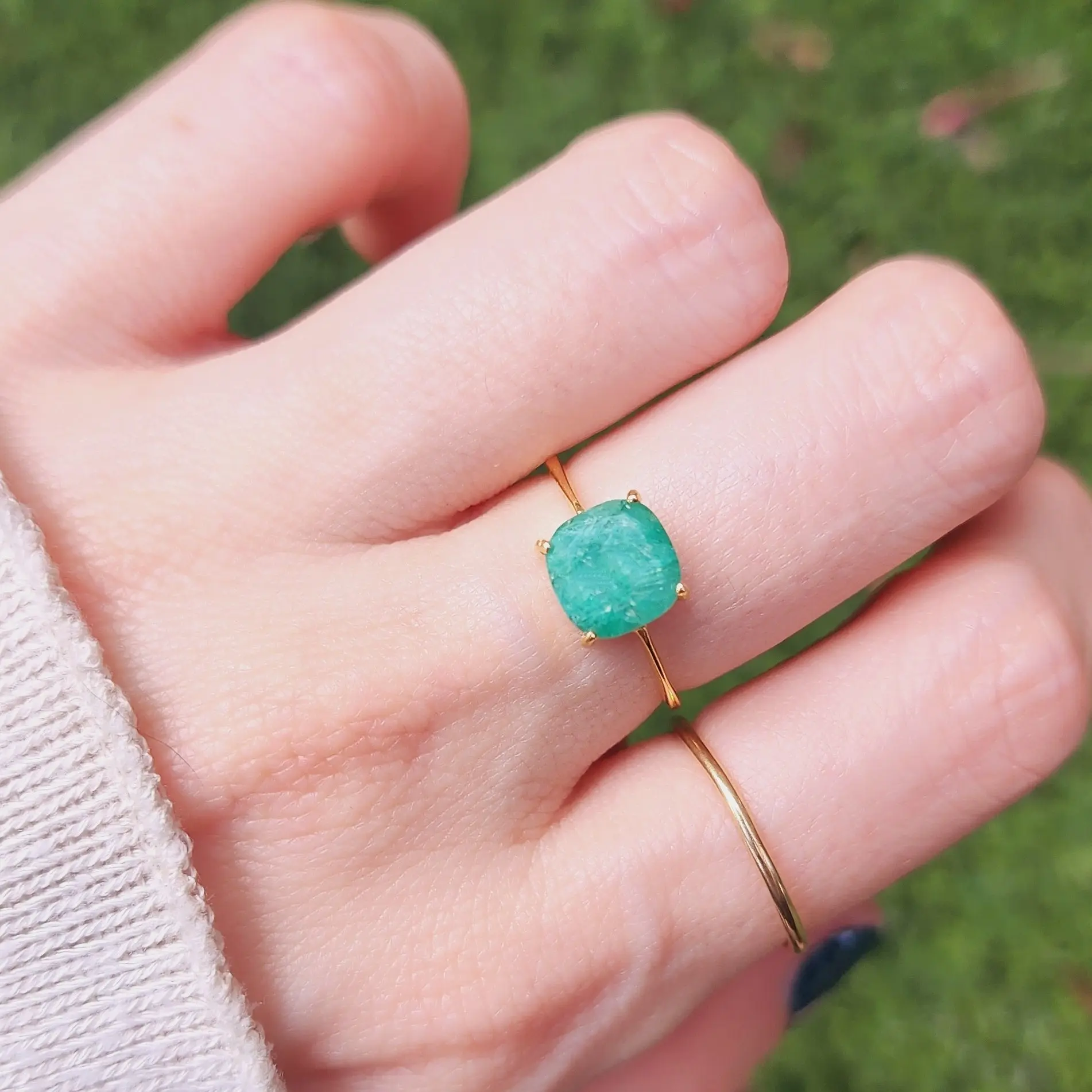- Natural Emerald ring - Dimensions: 8x8mm, 3 cts - Handmade in the USA - Sustainable and Ethically Sourced - Metals: .925 sterling silver, gold fill, rose gold fill, 14k white gold, 14k yellow gold, 14k rose gold. - All items are shipped wrapped in a gift box with a mission card about the animals we help.