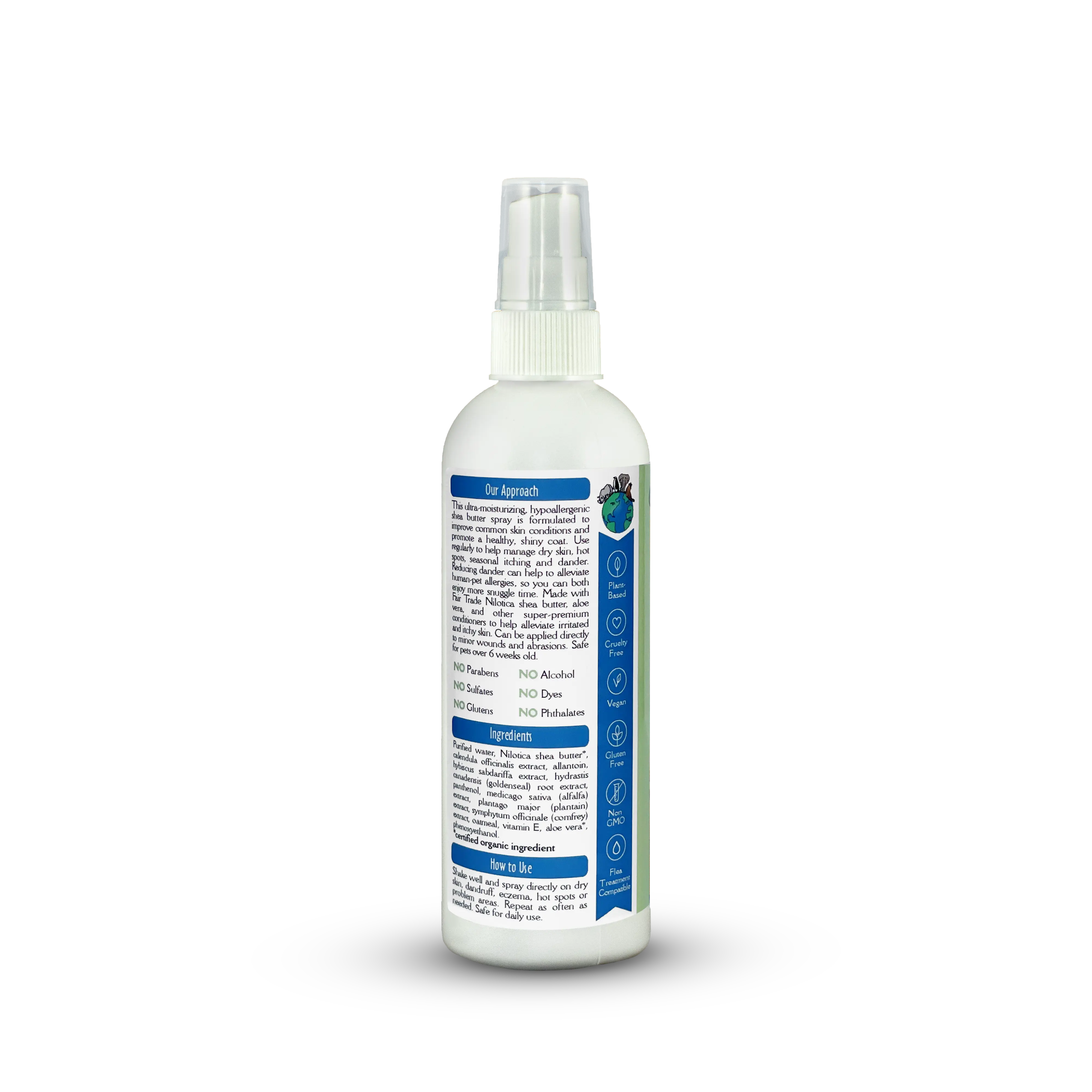 This ultra-moisturizing shea butter spray is formulated to improve common skin conditions and promote a healthy, shiny coat. Use regularly to help manage dry skin, hot spots, seasonal itching and dander. Reducing dander can help to alleviate human-pet allergies, so you can both enjoy more snuggle time. Made with shea butter, aloe vera, and other super-premium conditioners to help alleviate irritated and itchy skin. Can be applied directly to minor wounds and abrasions. Safe for pets over 6 weeks old.