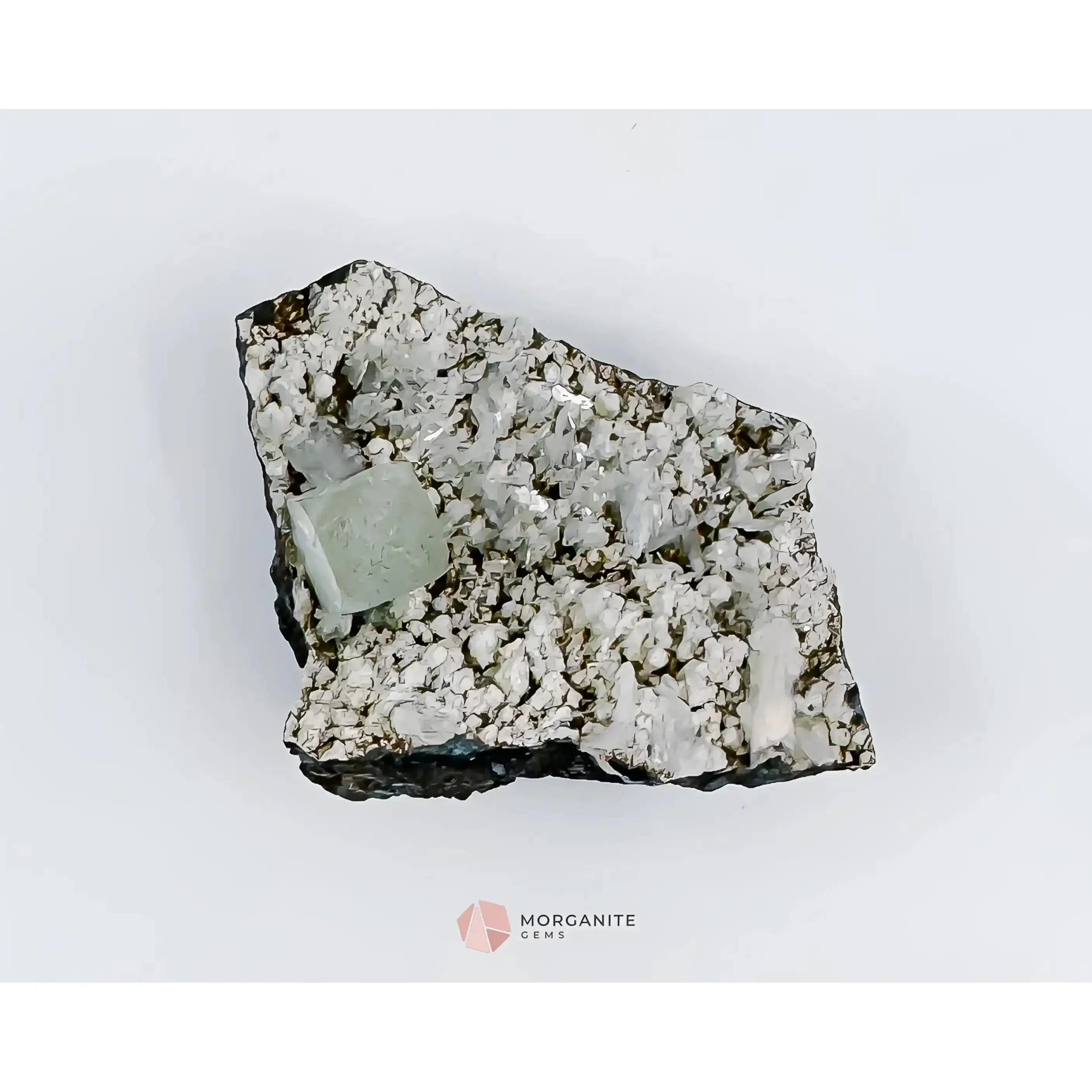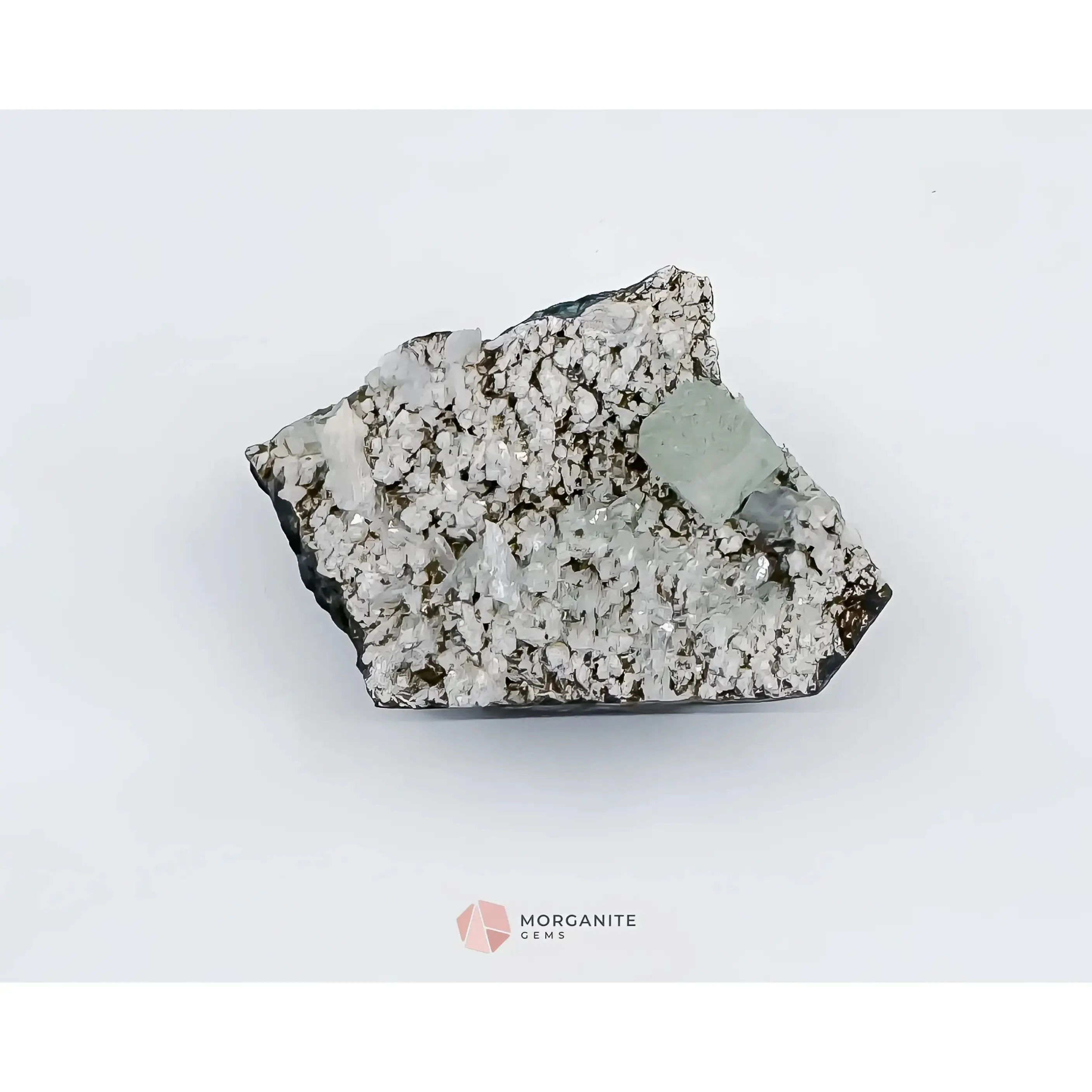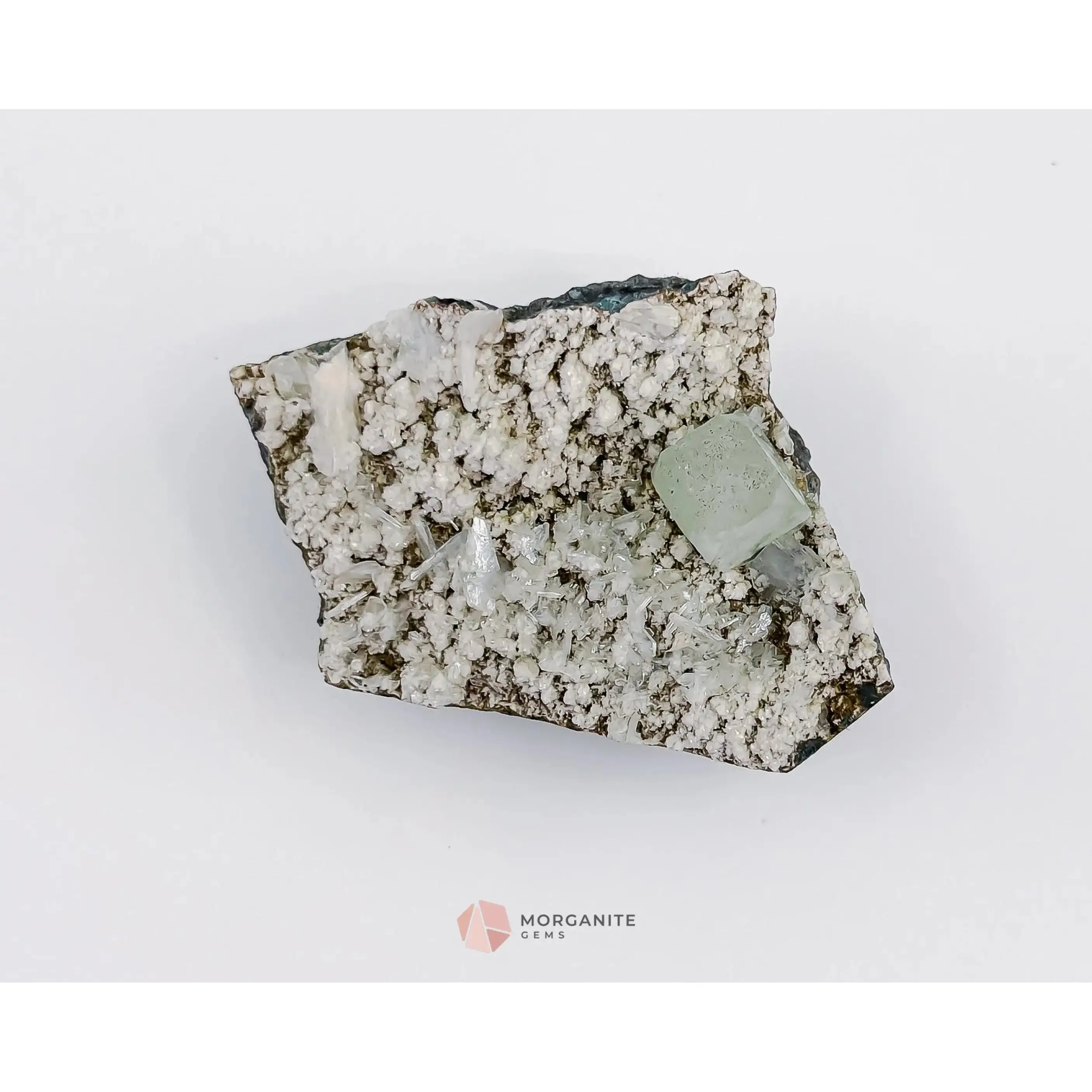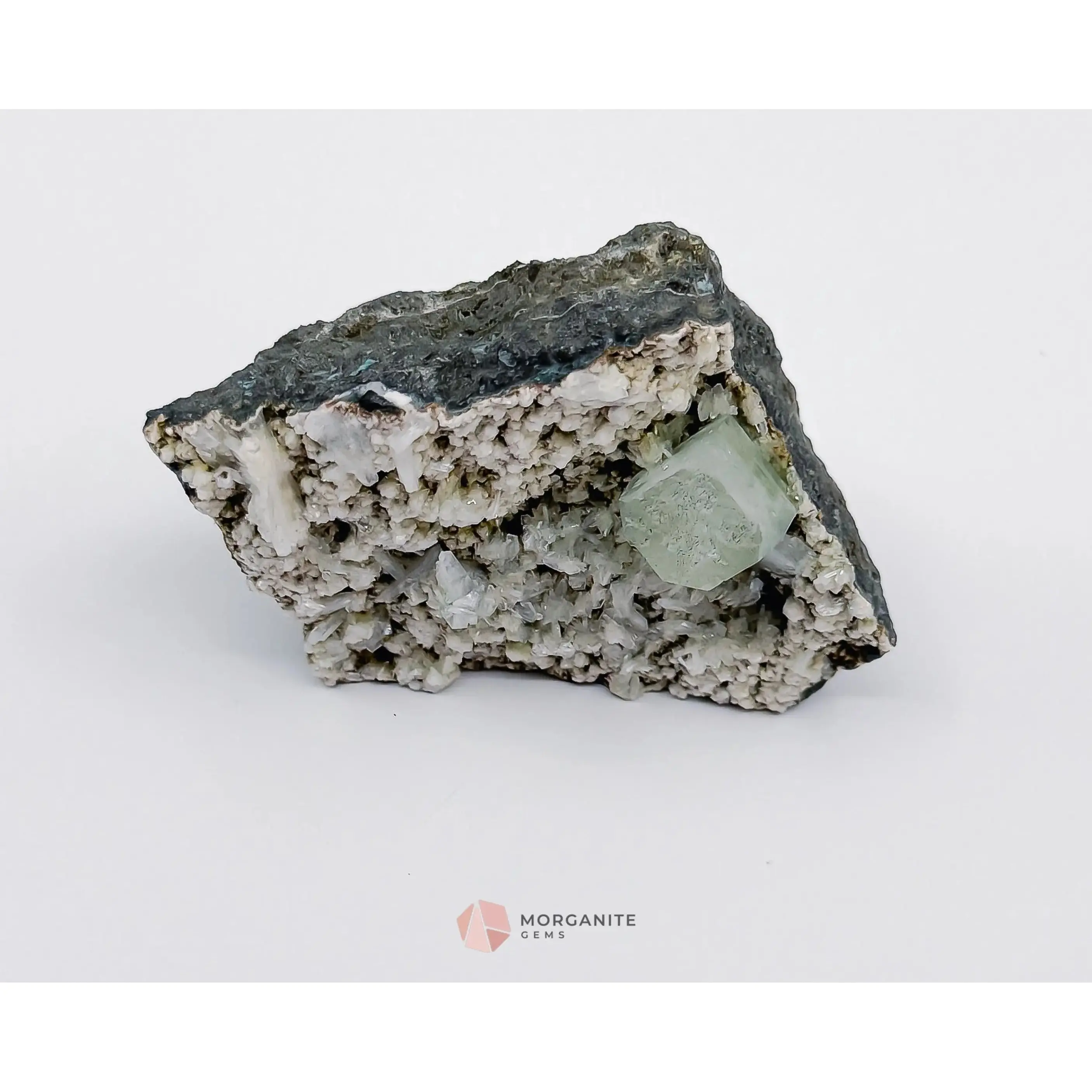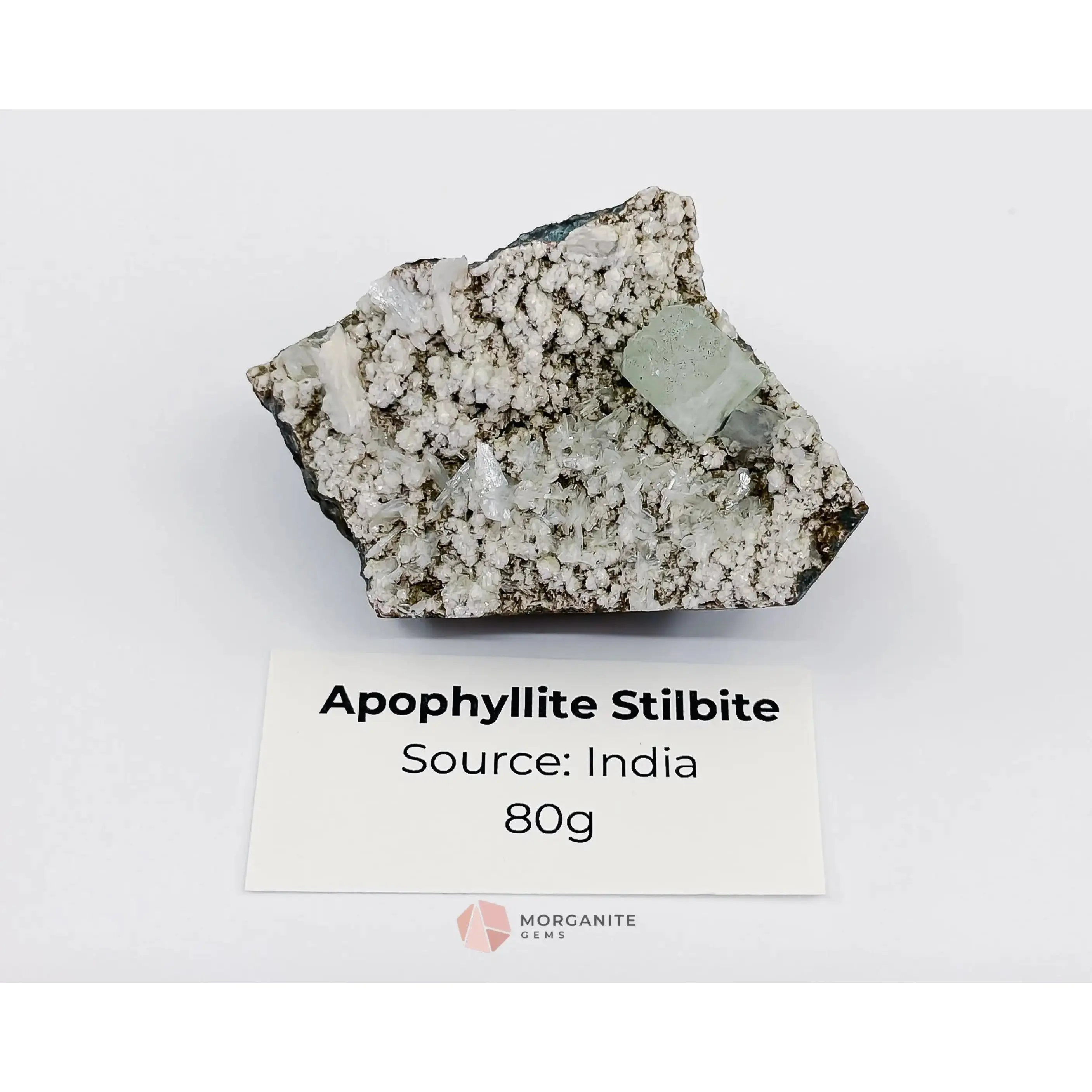 Elevate your collection with this striking 80g Apophyllite and Stilbite specimen, featuring a prominent green Apophyllite cube nestled within a cluster of shimmering Stilbite crystals. The piece is supported by a sturdy base of Chalcedony, creating a captivating contrast between the different minerals.
