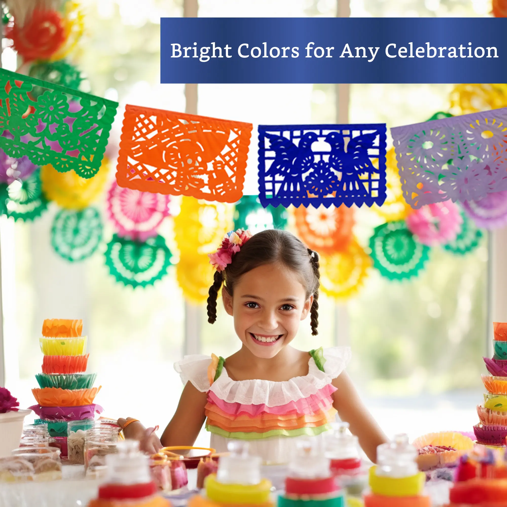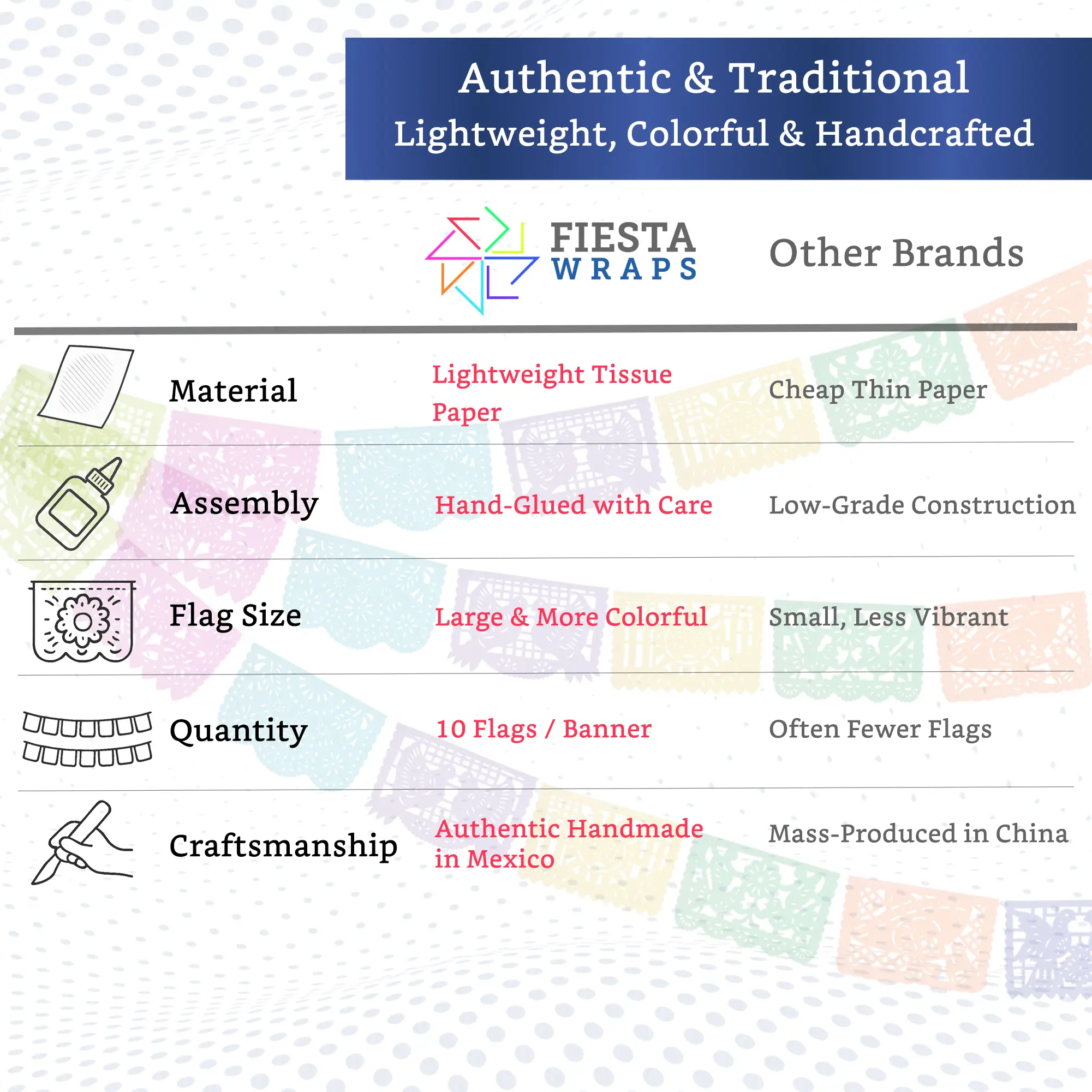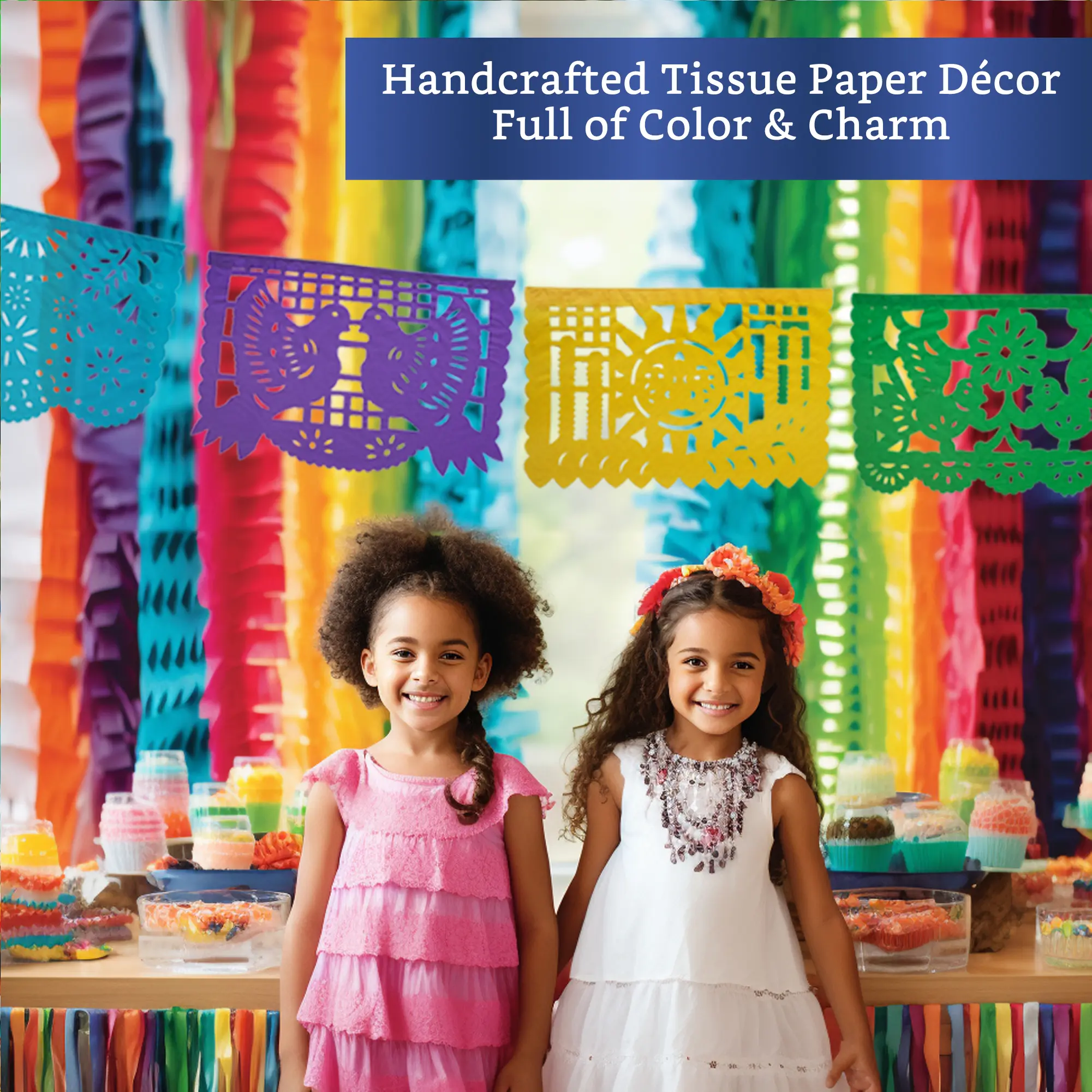Add vibrant flair to your fiestas with our handcrafted colorful Papel Picado tissue paper banners, authentically made in Central Mexico. These festive decorations are a beautiful way to honor Mexican culture at your next celebration. Whether you're planning a Cinco de Mayo party, birthday, baptism, wedding, or decorating a restaurant, these papel picado banners will instantly liven up your space with color, tradition, and joy.