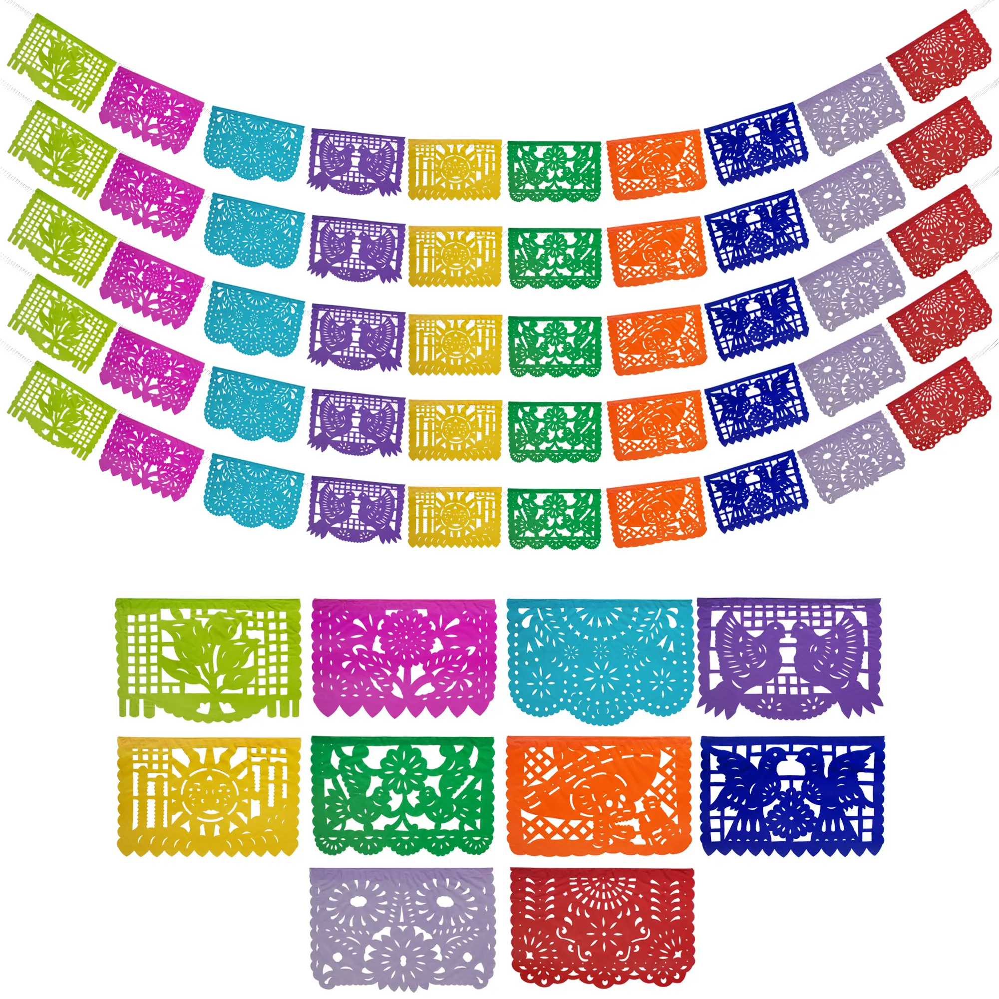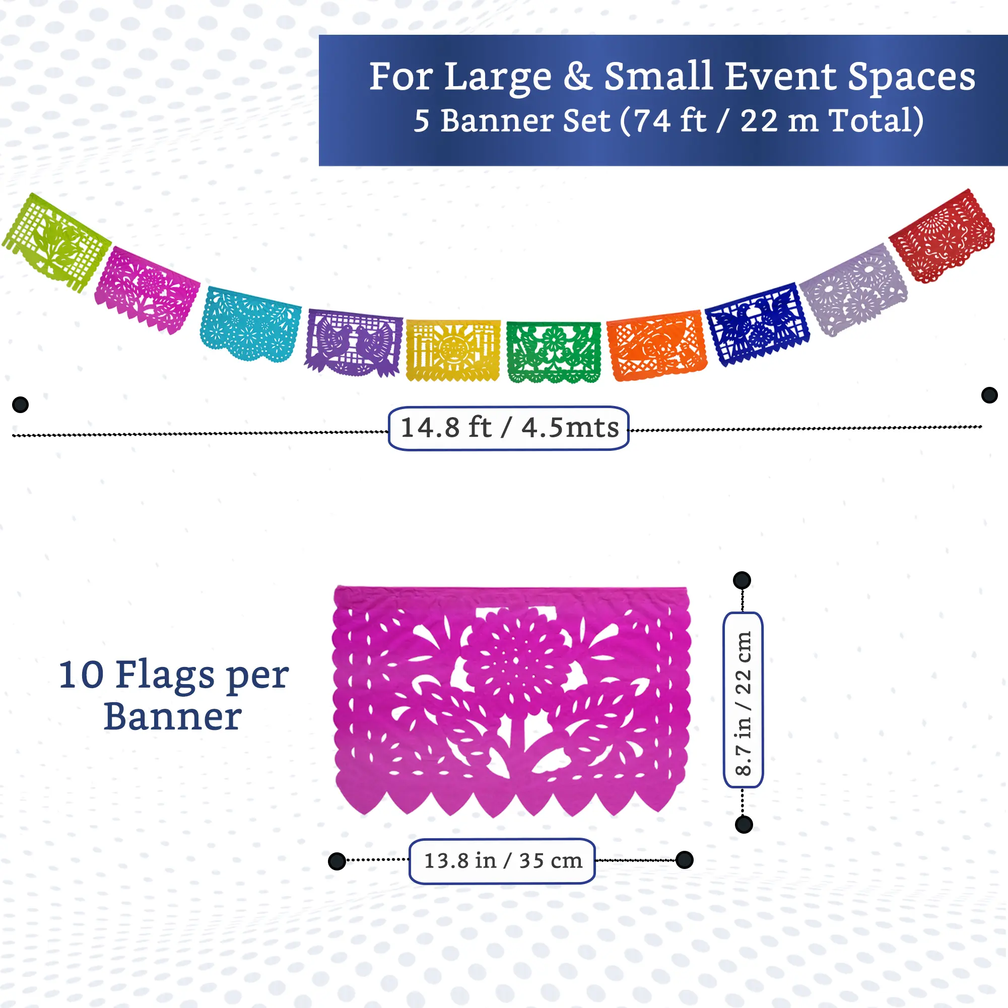 Set of 5 Banners: Each includes 10 unique cutout patterns in bright, festive colors—50 flags total.