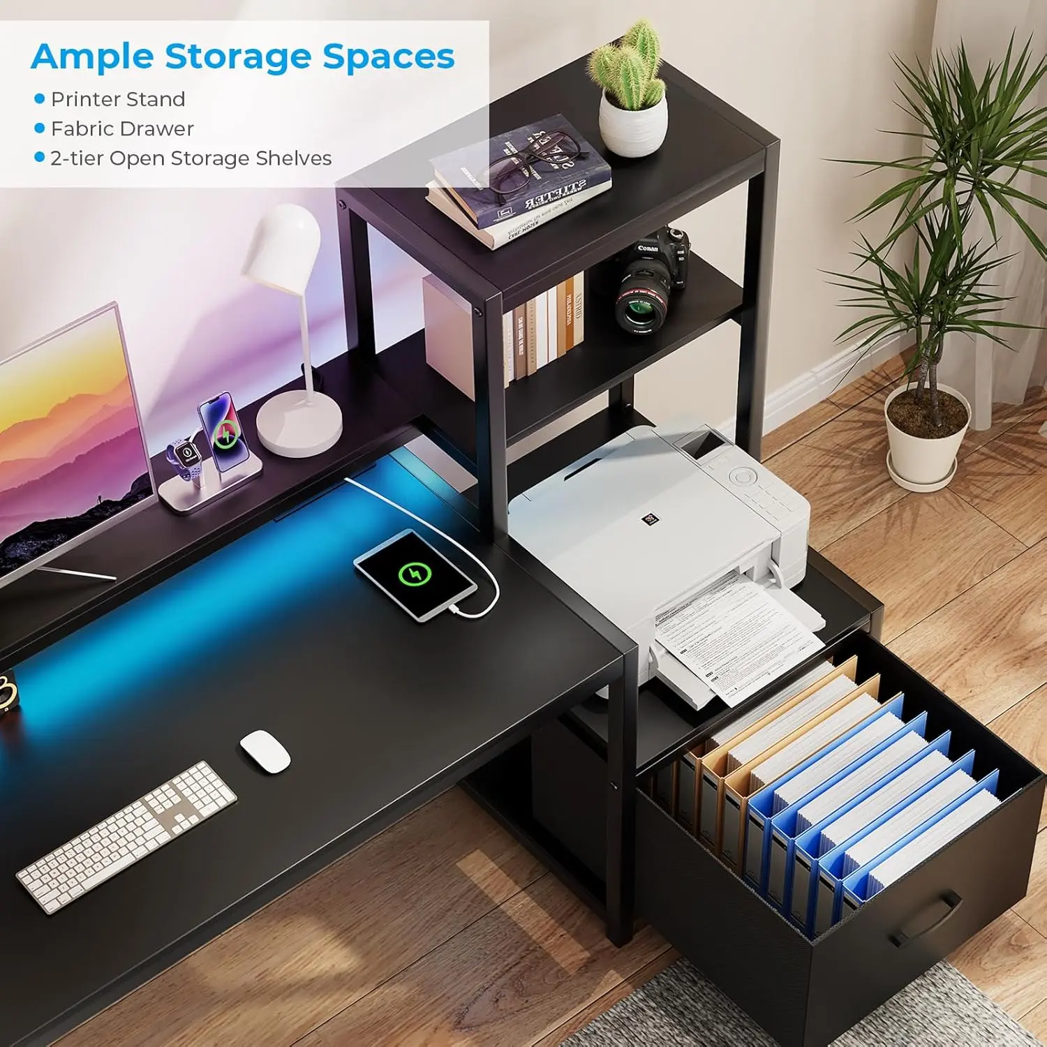 【LARGE COMPUTER DESK WITH PRINTER SPACE】This office desk has ample storage space.The dimension of middle shelf is 18.9x18.9inch,which is suitable for your large printer,fax machines,scanners or gaming CPU.Other 2-tier open shelves helps you to get work done effectivly with easy reach office supplies.