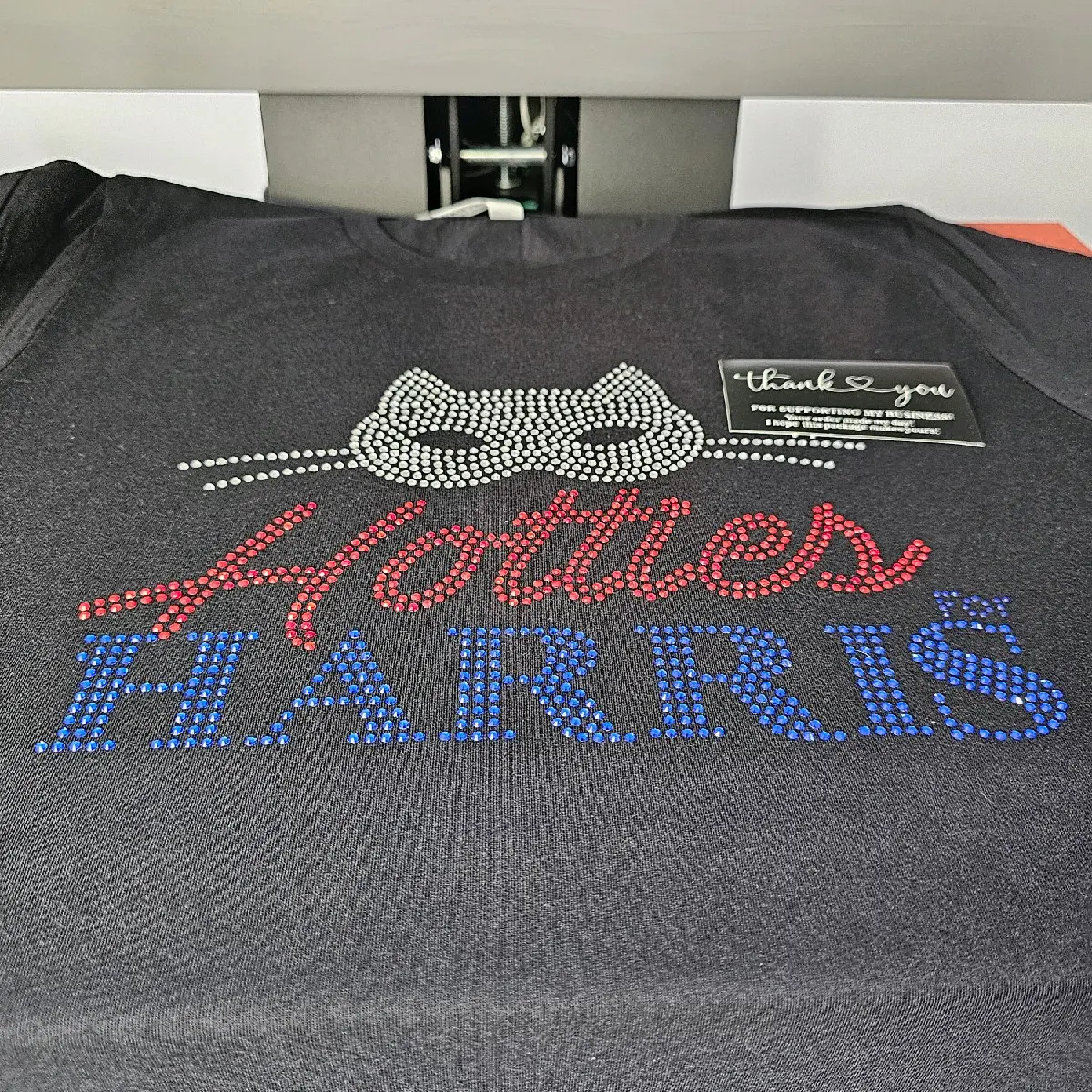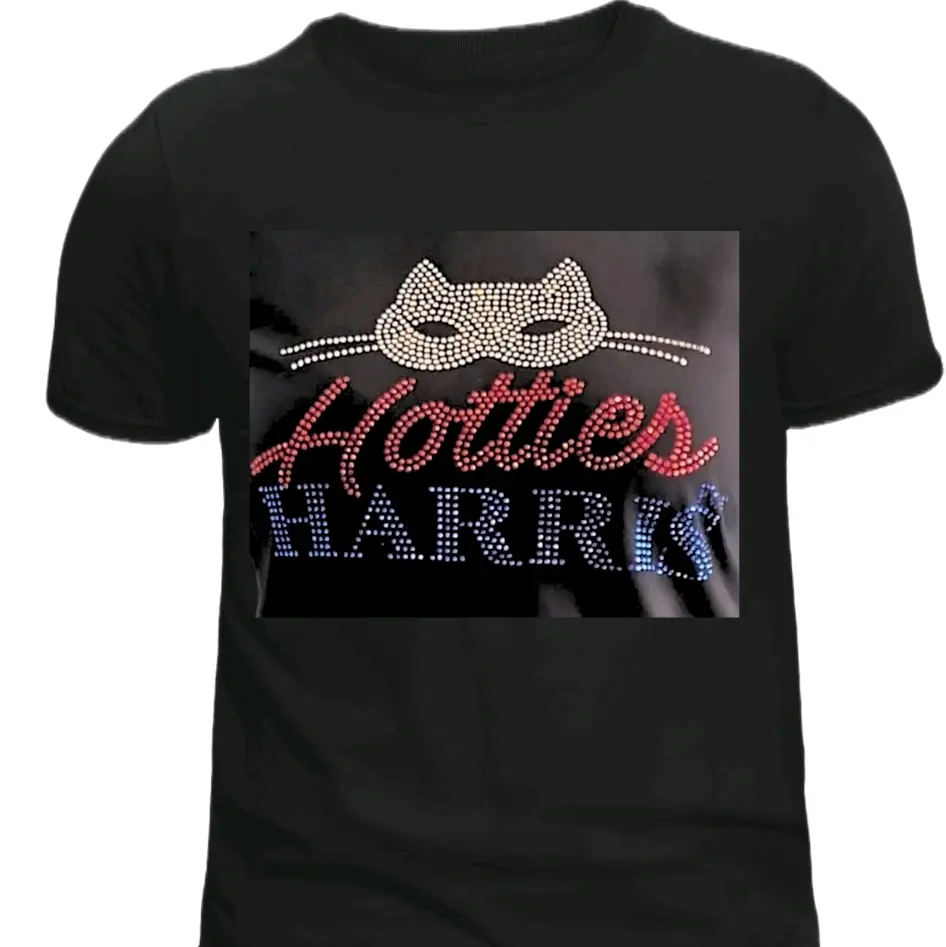 Turn heads and show your support for Kamala Harris with our dazzling rhinestone "Hotties for Harris" t-shirt! This unique tee features a fun and bold design with a sparkling cat-eye mask and the slogan "Hotties for Harris" in red, white, and blue rhinestones. Perfect for rallies, events, or adding a touch of bling to your everyday style, this shirt is a must-have for those who support Kamala and want to make a statement.