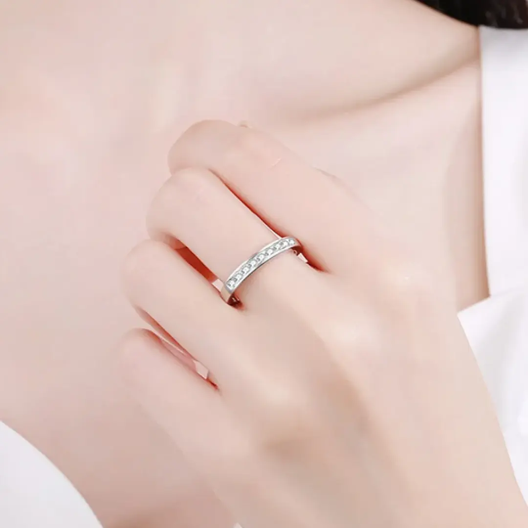 Add a touch of modern elegance to your jewelry collection with our stunning minimalist ring. Crafted from high-quality 925 sterling silver and featuring 9 shimmering moissanite stones totaling just under 1 carat, this piece exudes sophistication and luxury. The rhodium-plated finish adds a sleek, polished look, making it perfect for everyday wear or special occasions. Elevate your style with this contemporary and timeless ring that is sure to turn heads wherever you go.