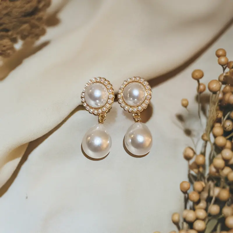 The earrings feature a classic and elegant design. Each earring boasts a large, lustrous pearl set in a shimmering gold-tone metal. The pearl is surrounded by a delicate tiny pearls, adding a touch of vintage charm. The earrings are finished with a single drop pearl, creating a graceful and sophisticated look.