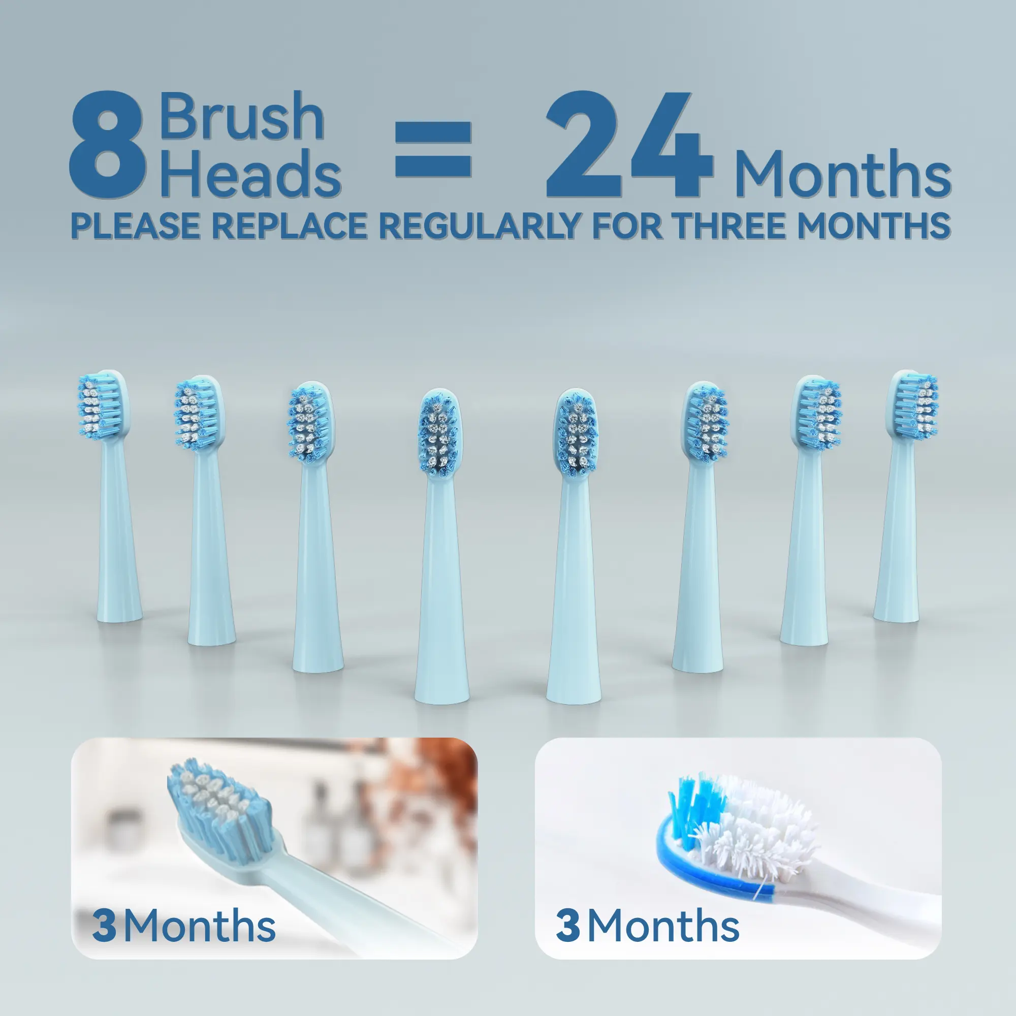 ·8 Replaccement Heads for over 24 Months Using The recommended use cycle of the brush head is three months, and not replacing the brush head for a long time will affect the cleaning effect. We have plenty of replacement brushes to solve the long-term replacement needs.