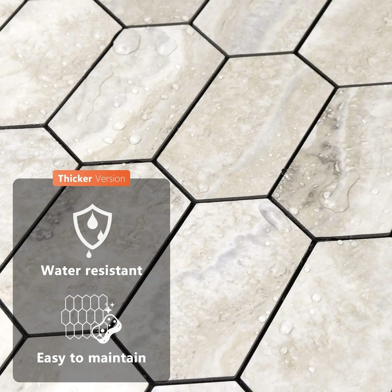 ·High Quality Tile: The peel and stick backsplash tile made of PVC composite laminate, waterproof, oil-proof, heat-resistant, keep the walls free from splashes and oil, and can be wiped easily even with stains. This version of the hexagon peel and stick backsplash is thicker and has a stronger adhesive backing, making it better than regular vinyl tile and more durable than plastic self-adhesive tile.