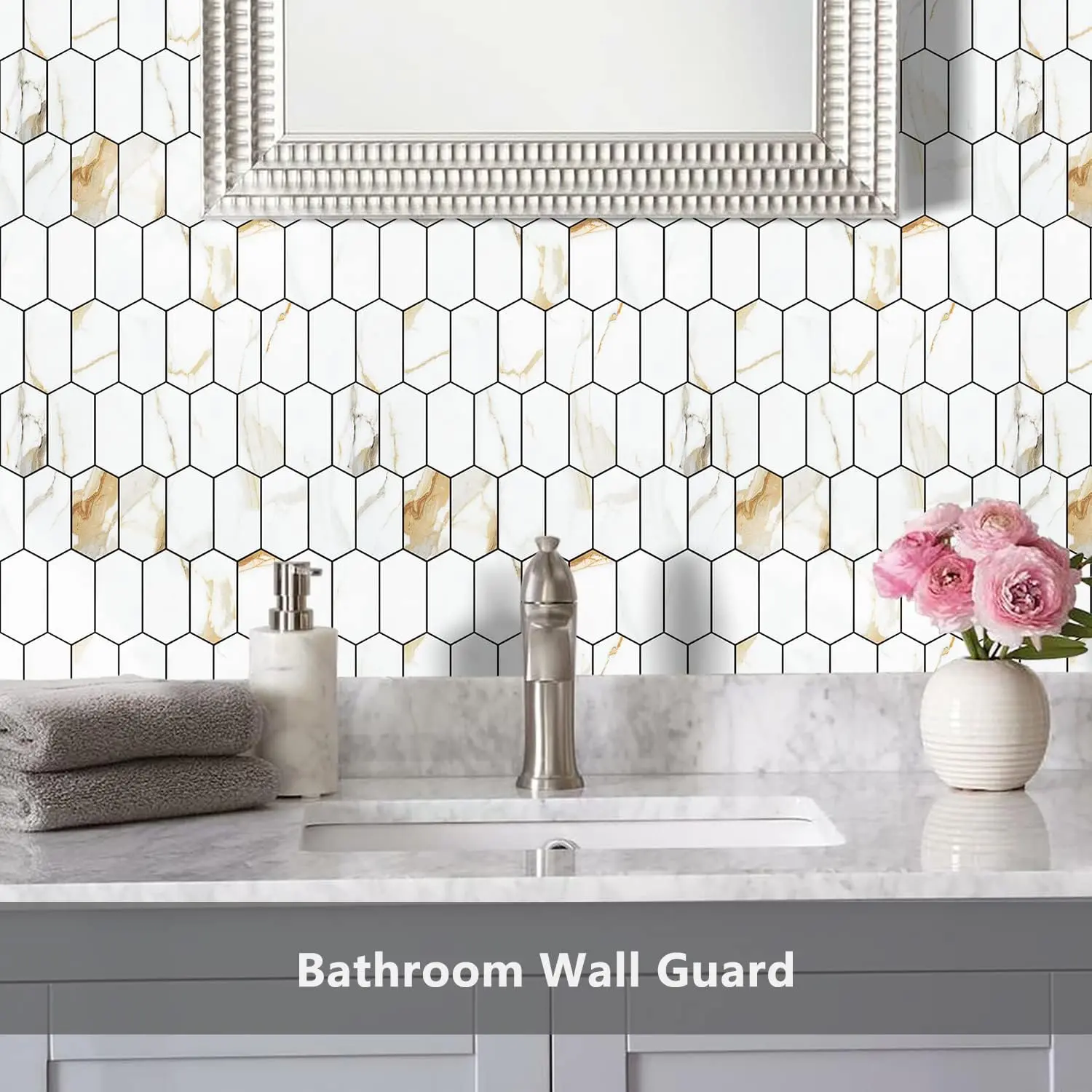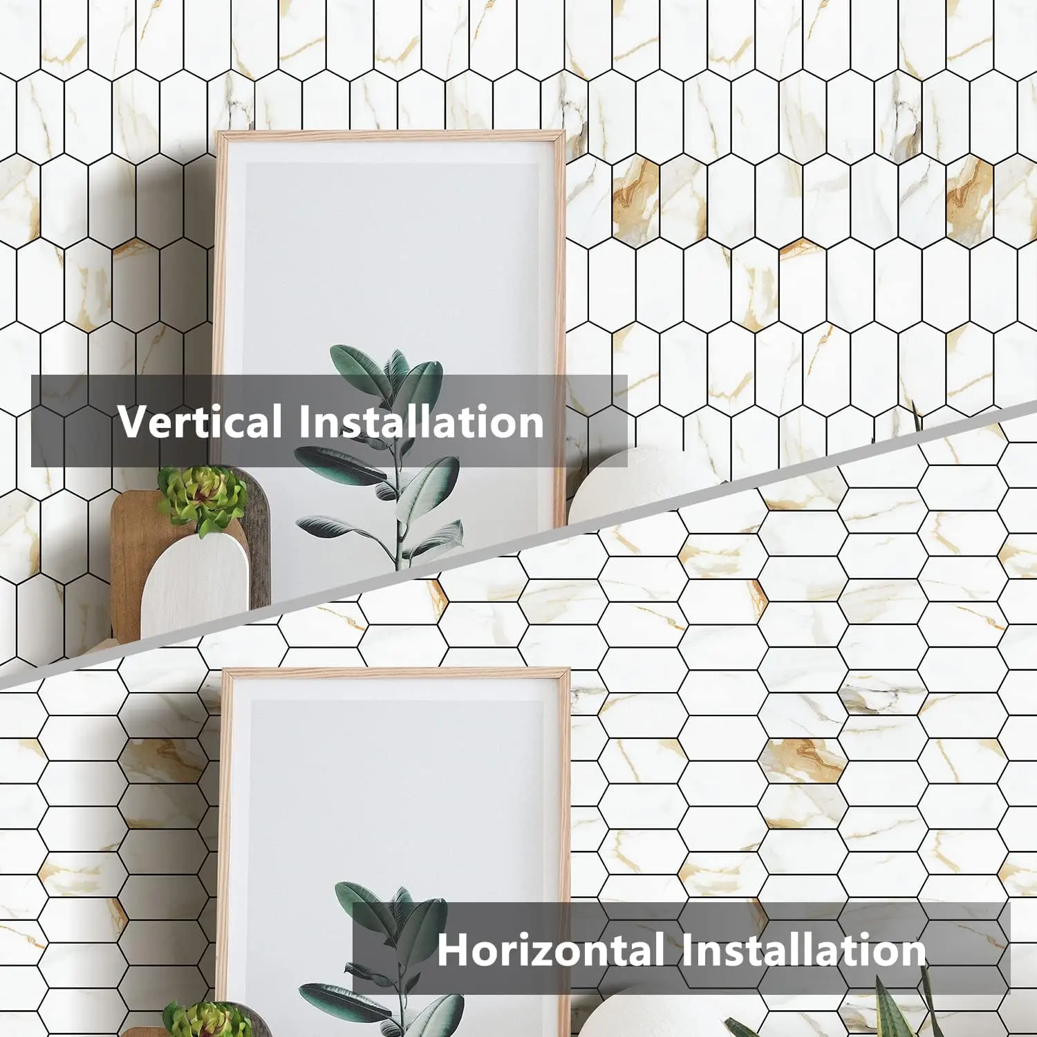·Long Hexagon Tile: 10 sheets Hex kitchen backsplash tiles peel and stick , 12.4"x12"x0.12" each, 1 pc= 0.94 sq. ft., Scratch Resistant, High Impact, Fade Resistant, peel and stick backsplash Realistic Marble Texture and Long Hexagon Design Install vertically or horizontally.