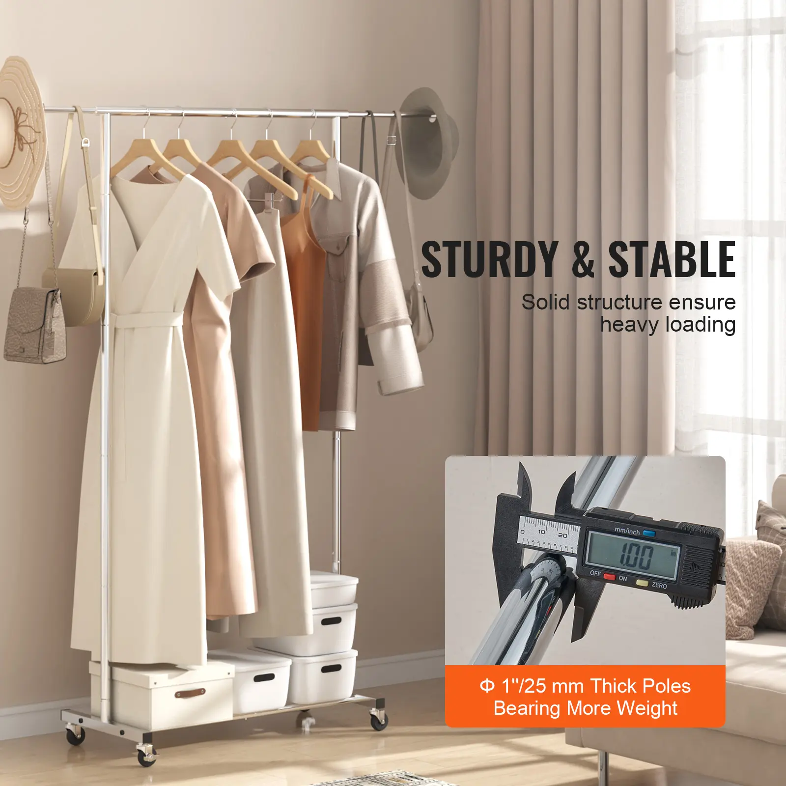 • Move or Fixed: VEVOR rolling garment rack come with four casters, two of which are lockable. Whether you need to effortlessly glide the rack across your bedroom for outfit selection or securely park it in place when ironing, these versatile casters ensure smooth mobility and steadfast stability, adapting to any situation.