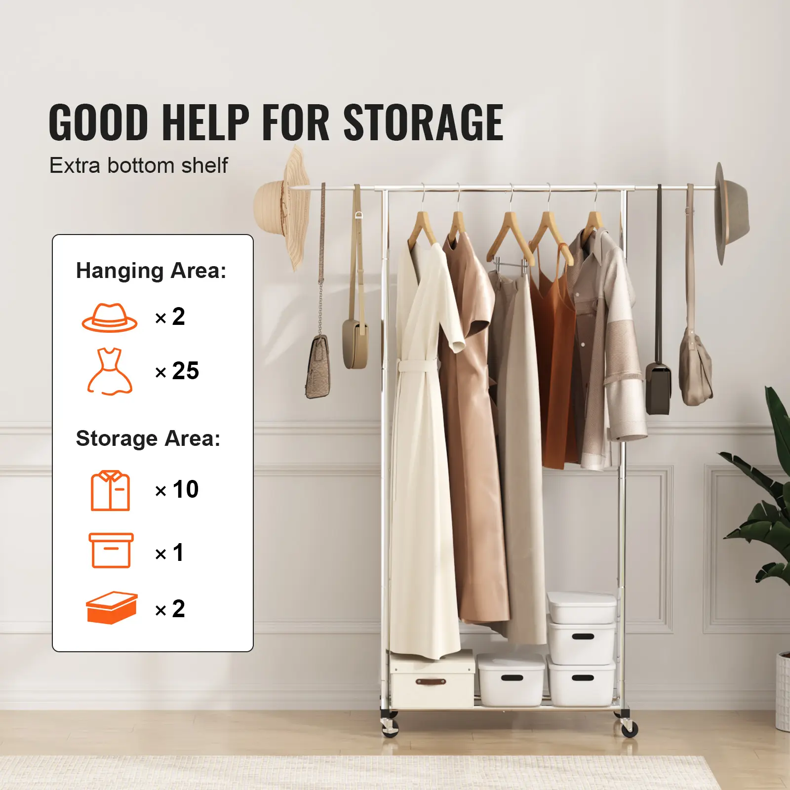 5. VEVOR Clothes Rack with Wheels, Heavy Duty Clothing Garment Rack with Hanging Rod and Bottom Storage Area, Adjustable Length Clothing Rack, 2 Lockable Wheels