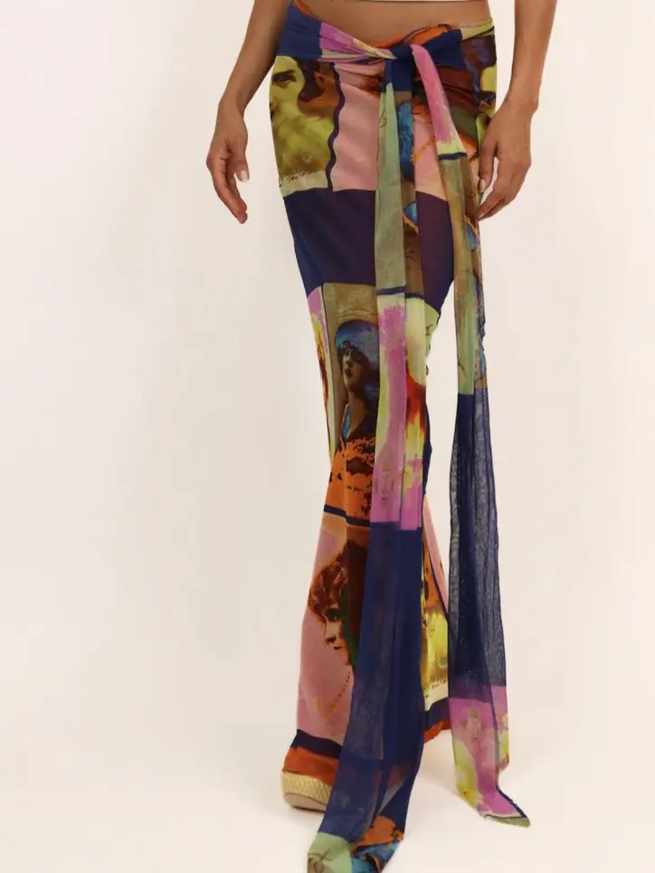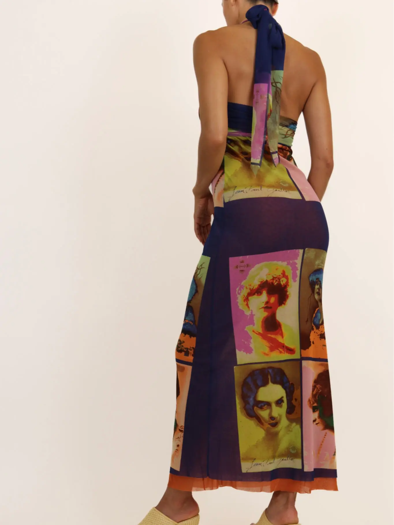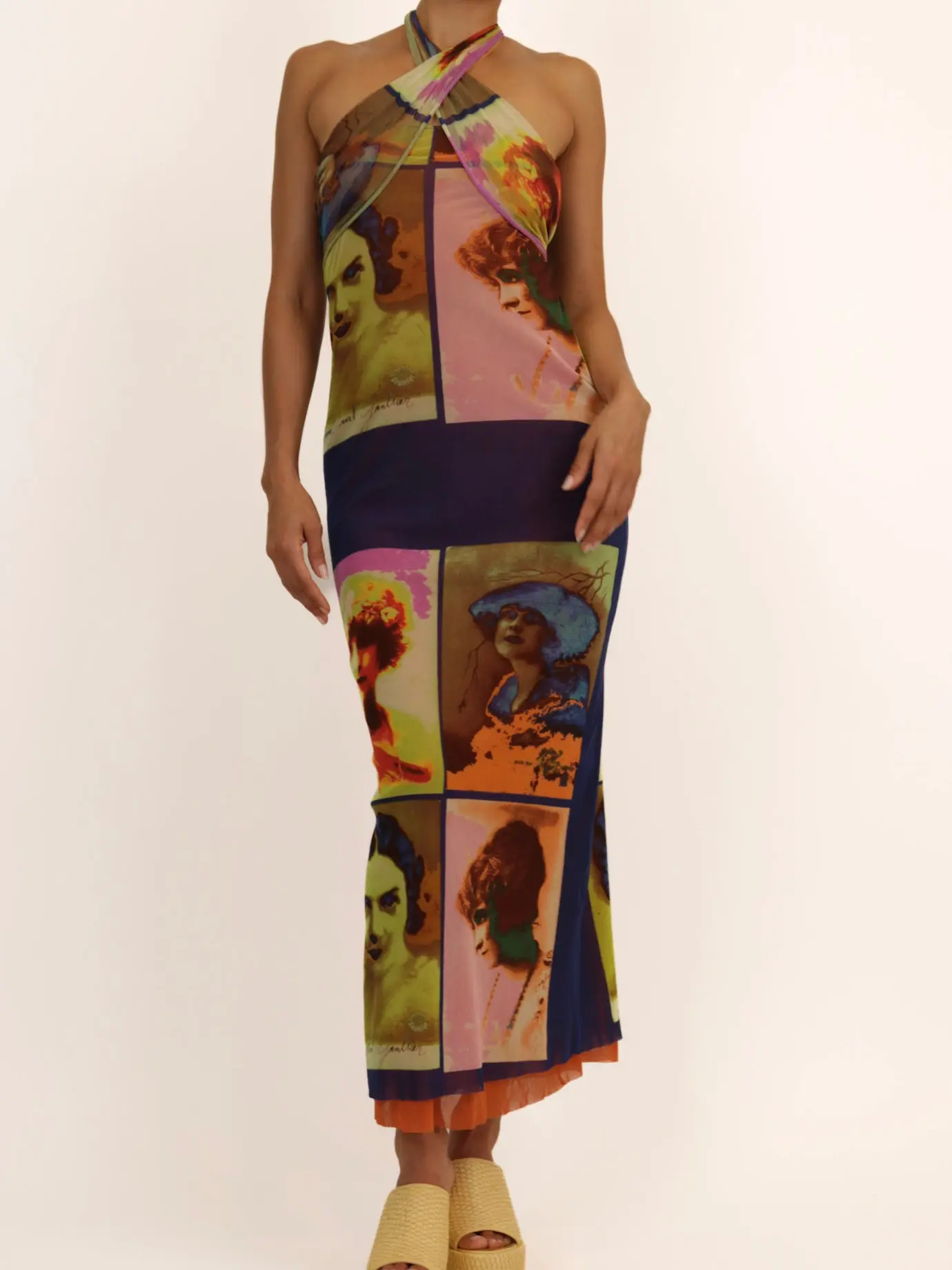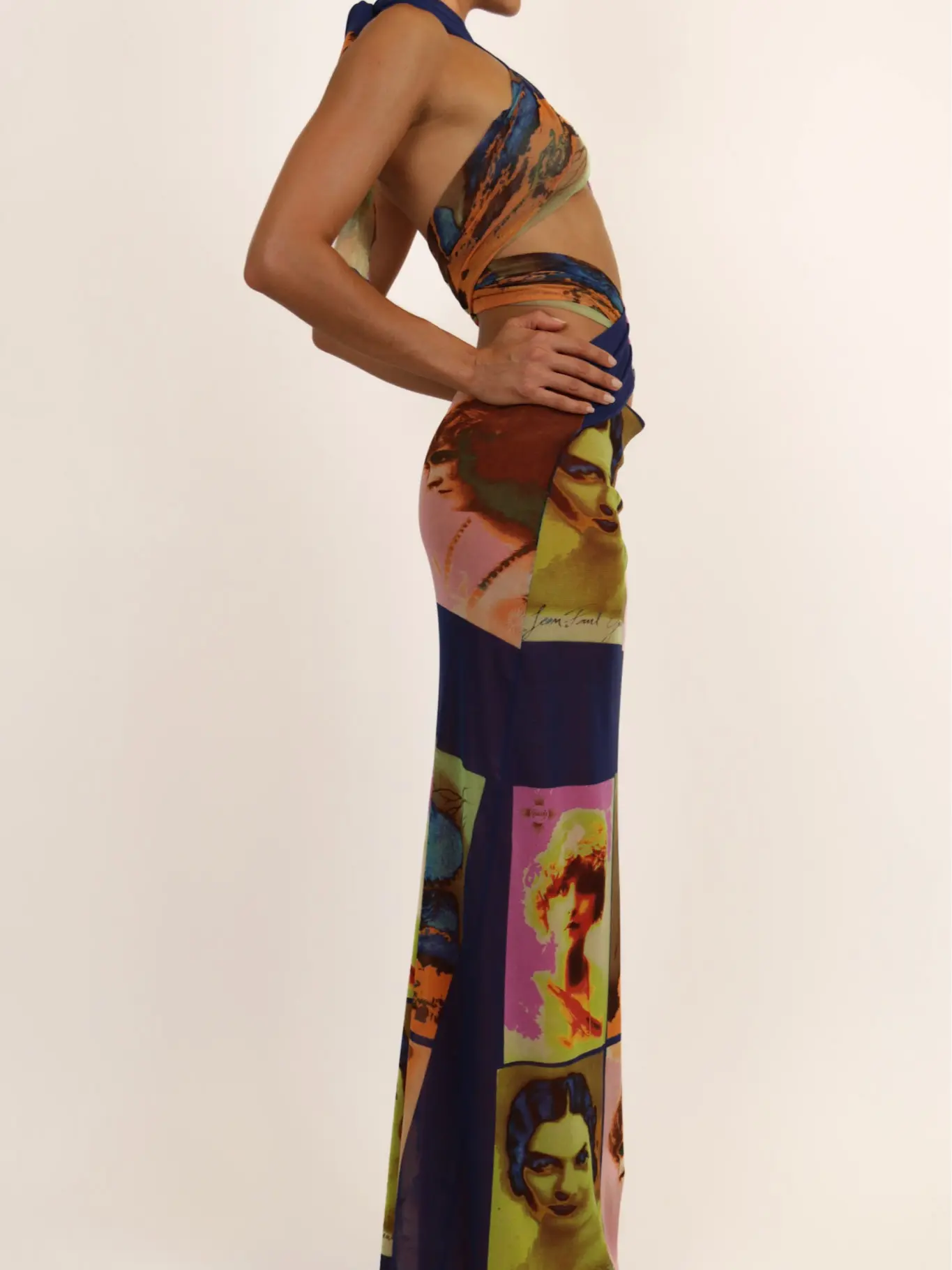 The dress features a vibrant, multicolored design adorned with iconic pop art-style portraits, paying homage to classic Hollywood glamour. The body-hugging silhouette is accentuated by a striking sash that can be worn in multiple ways, allowing for versatile styling.