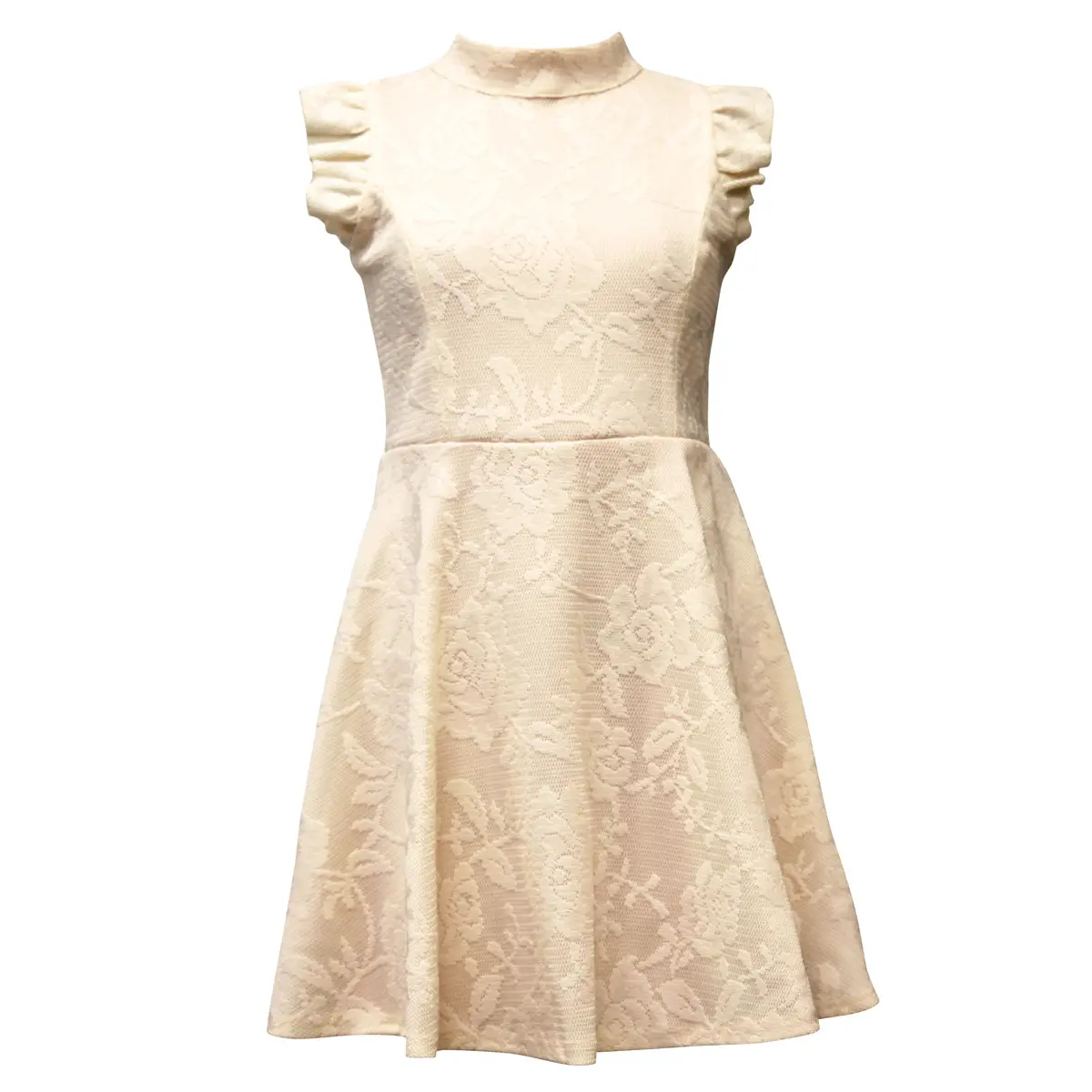 This Mock Flutter Sleeve Dress is perfect for big girls. The mock neck and ruffle sleeves are complemented by a beautiful lace print, making it a stylish and elegant choice for any occasion. Add a sparkle to your daughter's wardrobe with this timeless dress.
