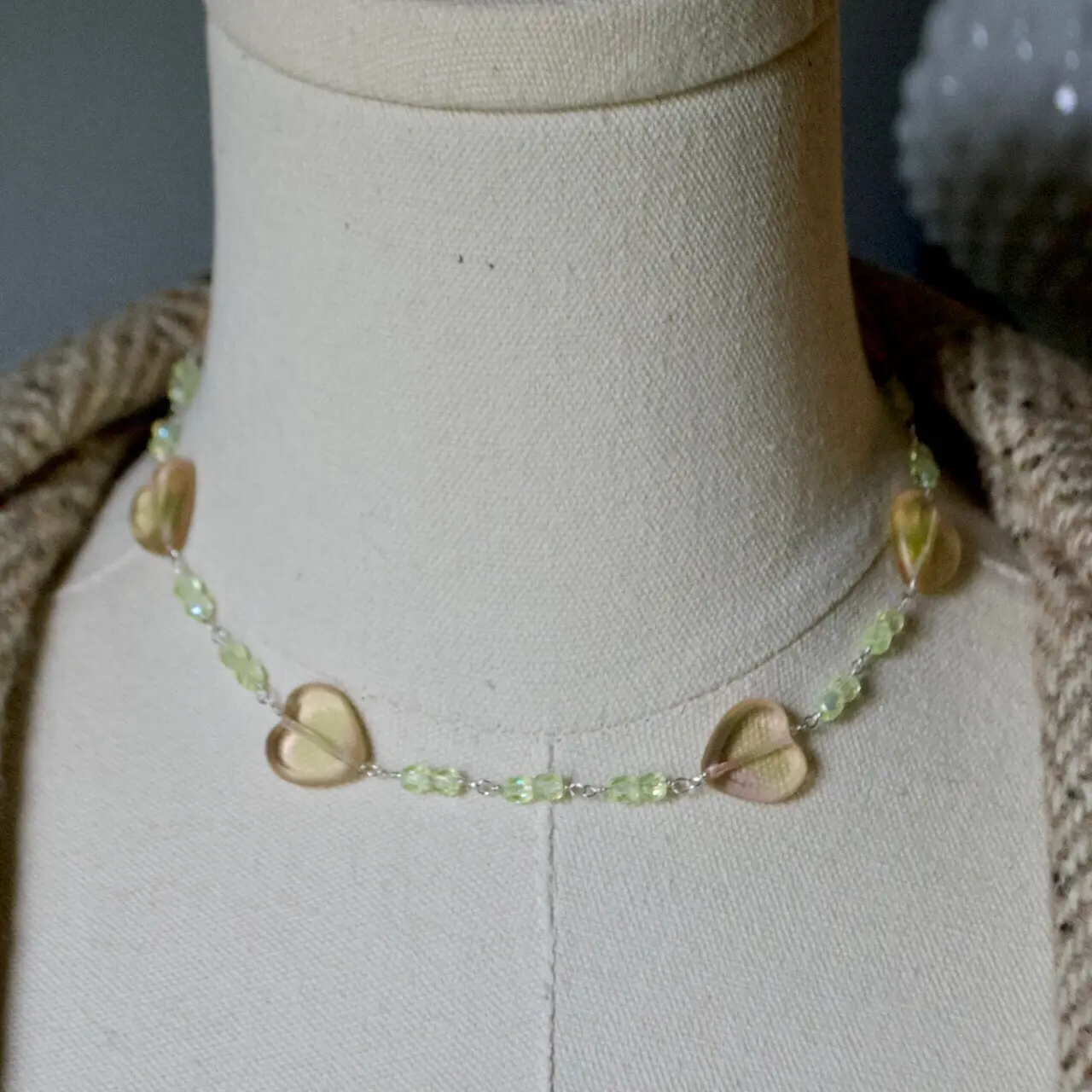 15” Solid Sterling Silver Vaseline Yellow & Pink Beaded Heart Necklace