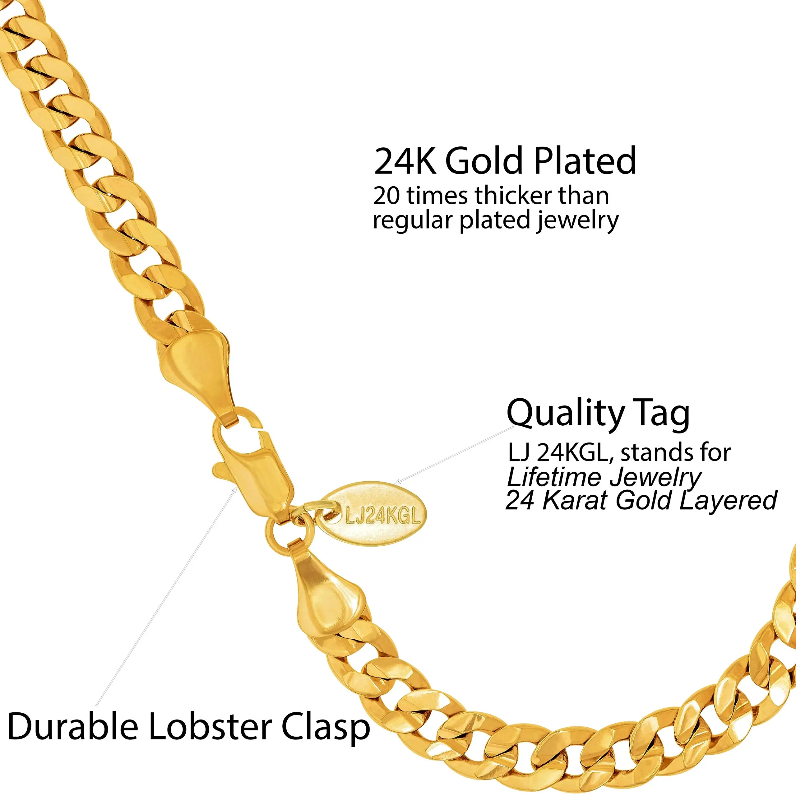 These 6mm ( ~ 1/4 inch) Diamond Cut Miami Curb Chain Bracelets are made to last with up to 20X more 24 karat real gold plating than standard electroplated fashion jewelry; Comes in yellow gold or white gold (rhodium); Available in 7 8 and 9 inches