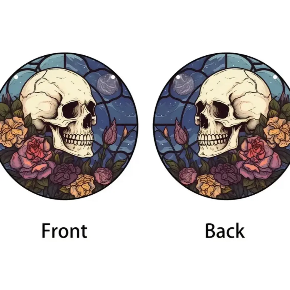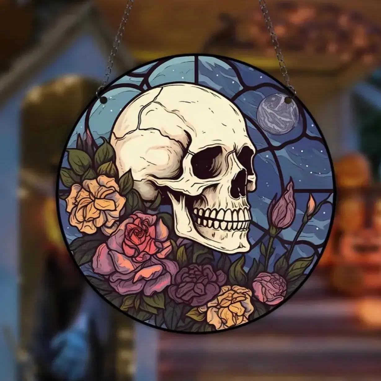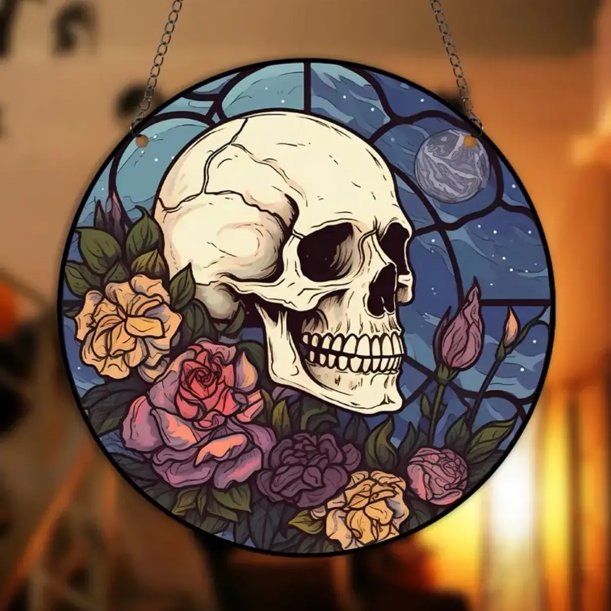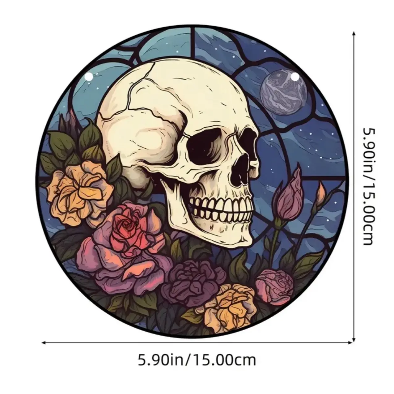 Add a hauntingly beautiful touch to your Halloween décor with this spooky skull and rose stained glass acrylic suncatcher. Measuring 5.90" x 5.90", this eerie yet elegant piece is perfect for those who love to embrace the darker side of the season. The detailed skull design, paired with a delicate rose, creates a striking contrast, making it a standout decoration for windows or any spot that catches the light.
