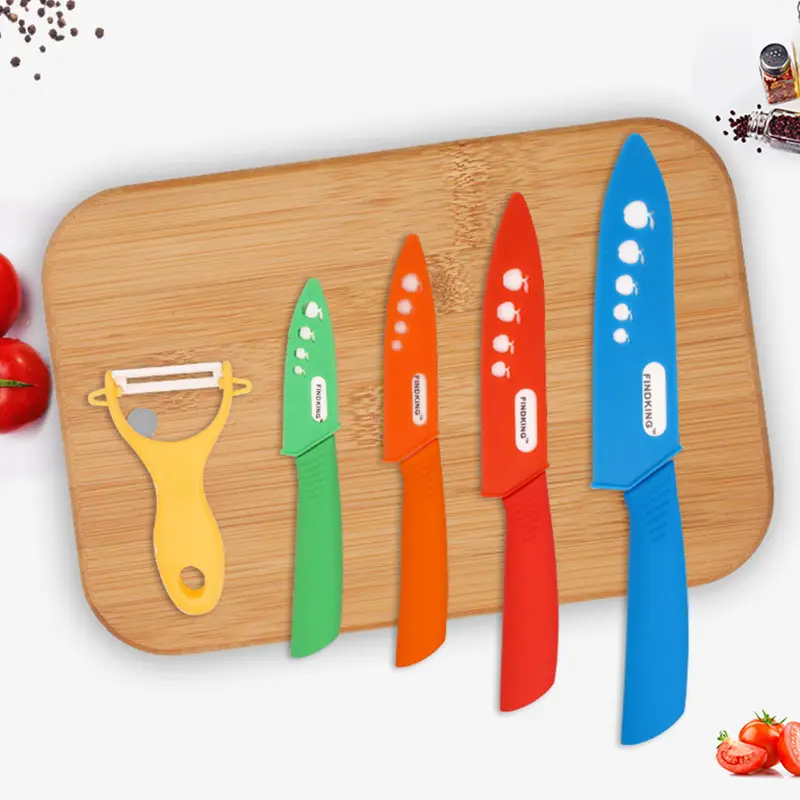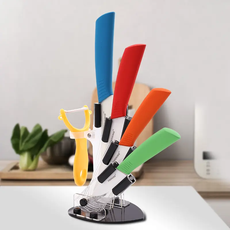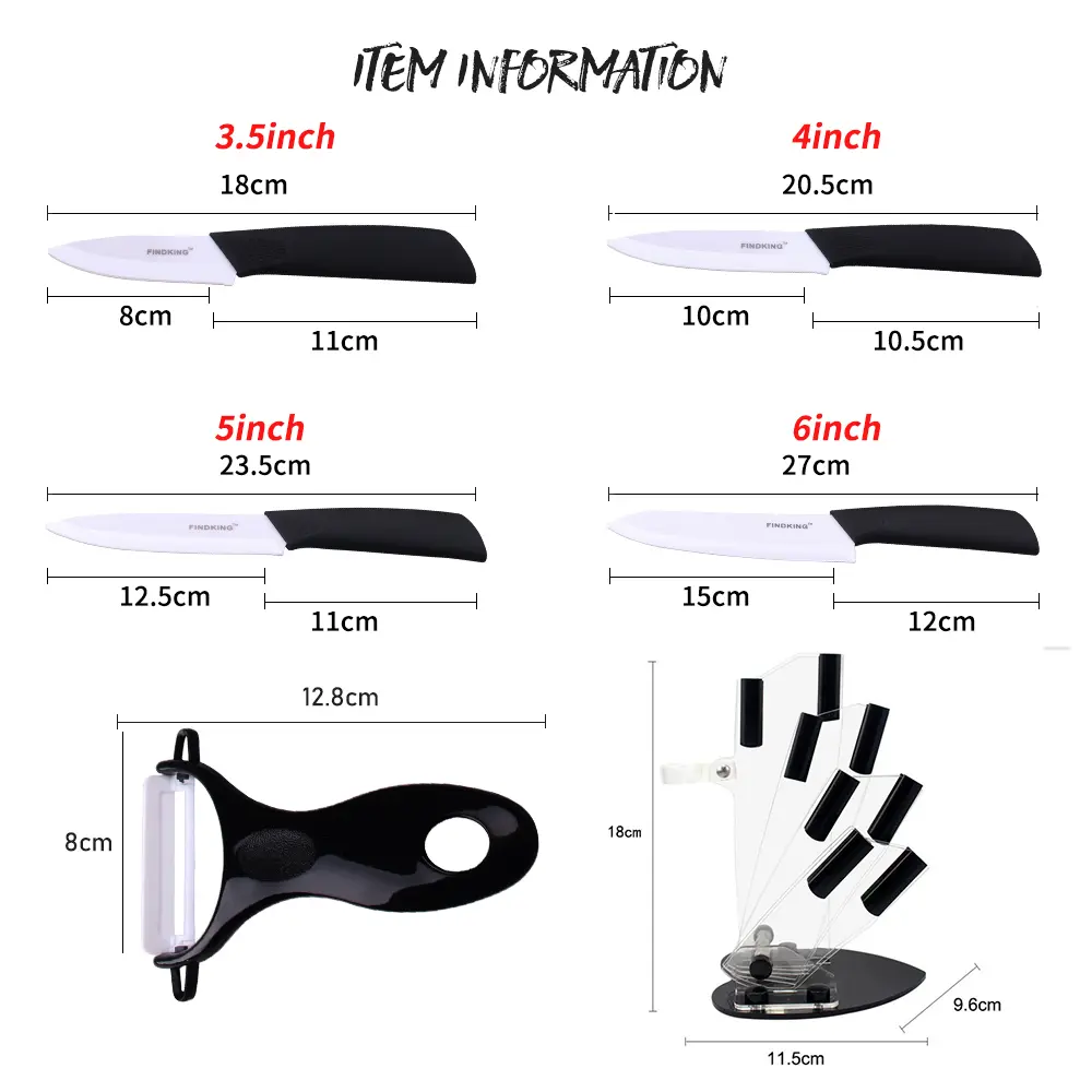 This FINDKING 6pcs Ceramic Knife set includes knives of 3", 4", 5", and 6 inches. It also comes with a peeler and an acrylic holder. Ideal for cutting meat, vegetables, and fruits. This set is a must-have for any kitchen. 🍽️