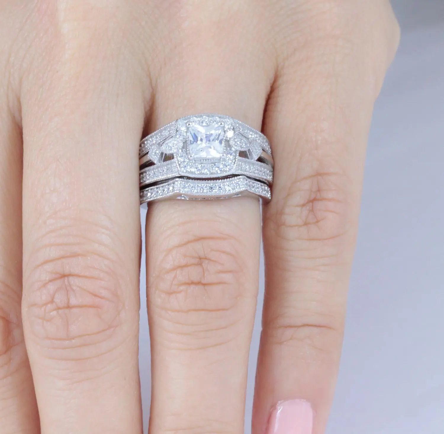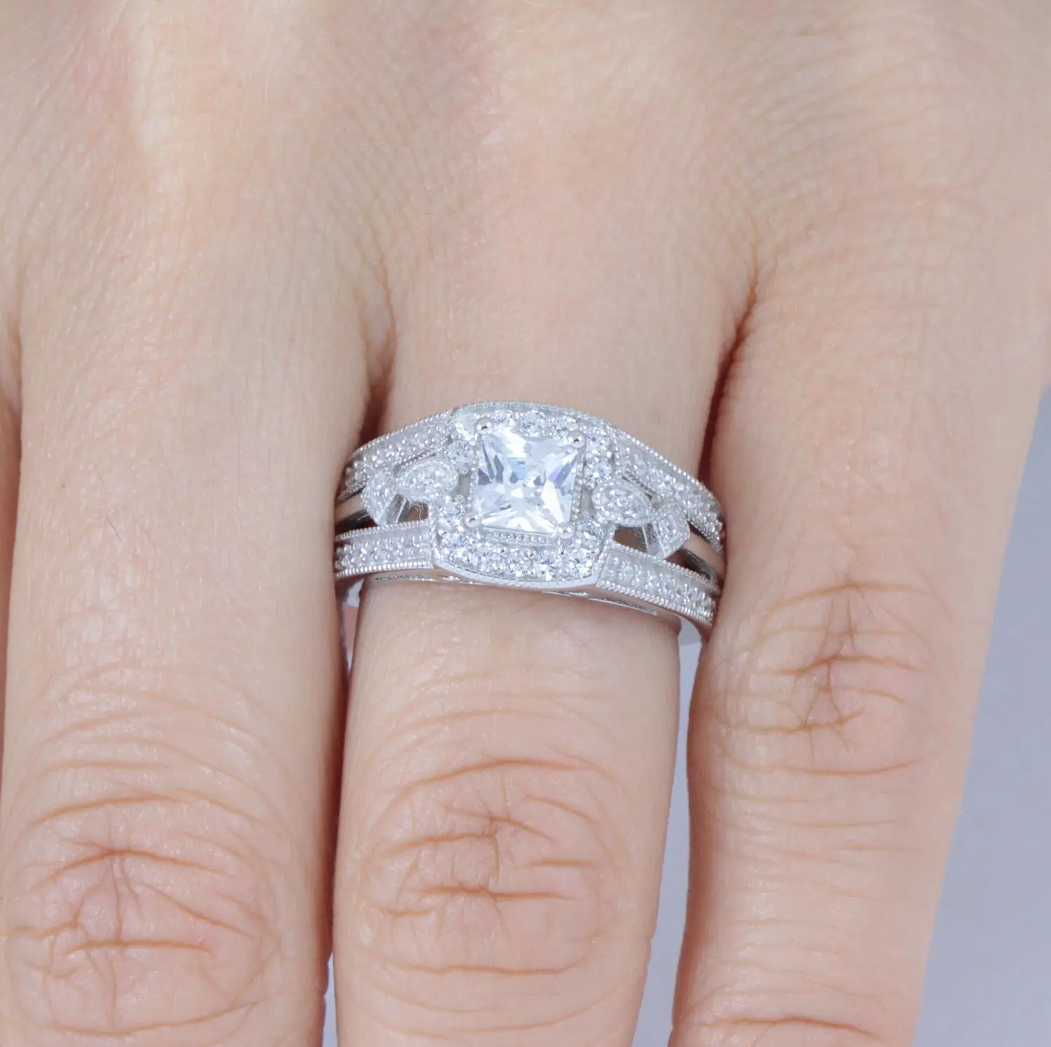 You are looking at gorgeous 2pc .925 sterling silver CZ wedding band engagement rings set. Engagement ring features a 5mm princess cut center stone, 14pcs 1.5mm round cut side stones, and 42pcs 1mm accent stones. Matching wedding band has 21pcs 1mm round cut stones. Top quality AAA Cubic Zirconia display amazing enriched clarity just like real diamonds! Total carat weight is approx. 2.5 carats diamond equivalent. Set in .925 sterling silver (stamped) and finished with rhodium plating for maximum shine and protection.