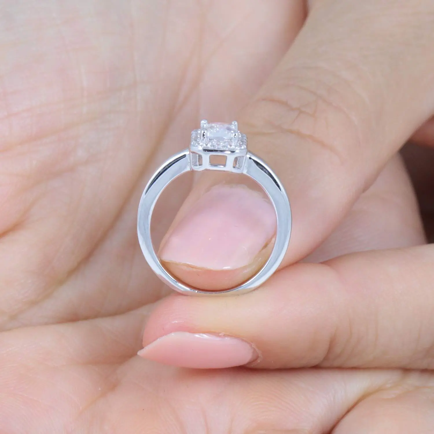 You are looking at gorgeous rectangular shape 925 sterling silver CZ engagement/fashion ring. The ring features a 6*4mm (0.6 Carat) radiant cut center stone, and 18pcs 1.25mm round cut accent stones. Top quality AAA Cubic Zirconia display amazing enriched clarity just like real diamonds! Total carat weight is approx. 0.76 carats diamond equivalent. Set in .925 sterling silver (stamped) and finished with rhodium plating for maximum shine and protection.