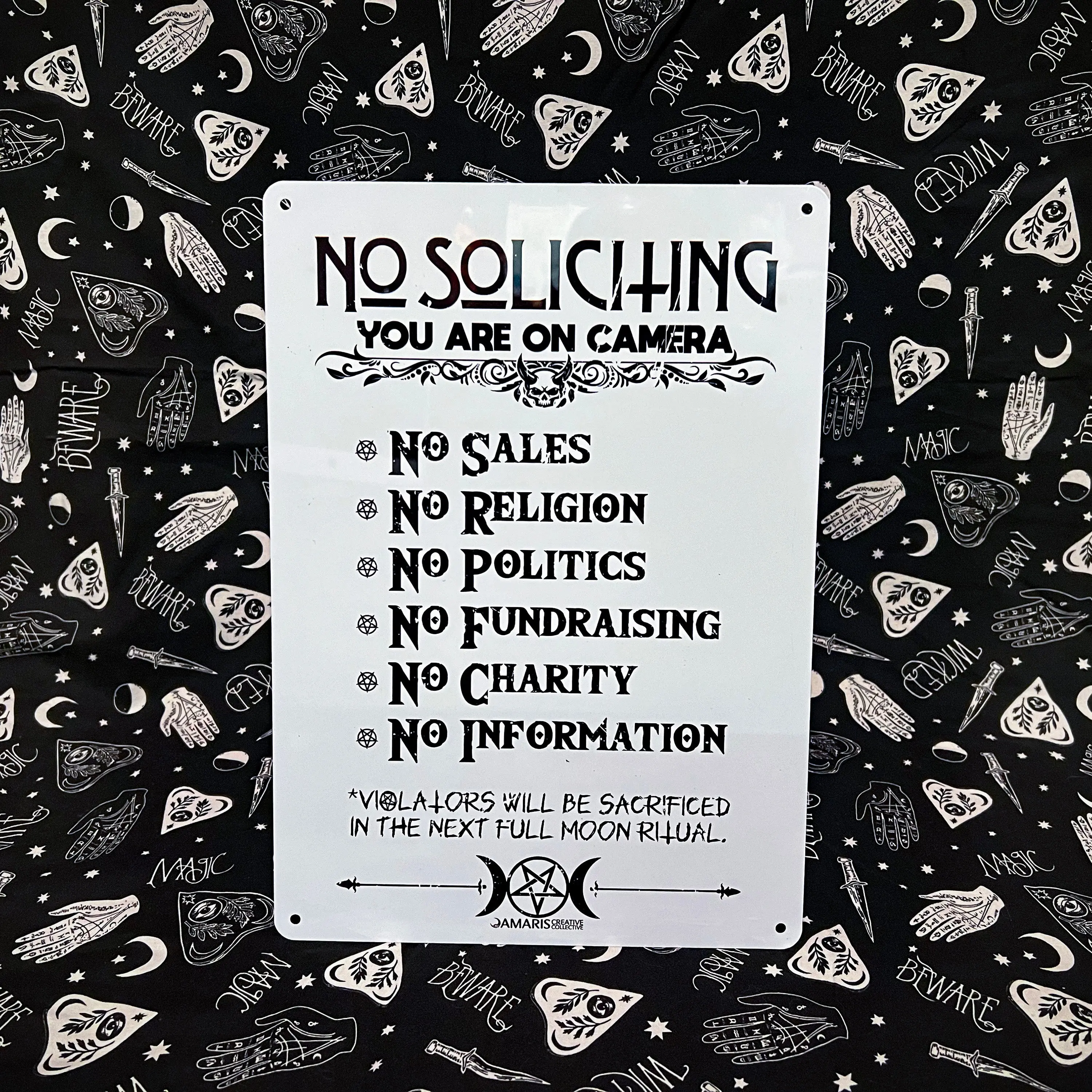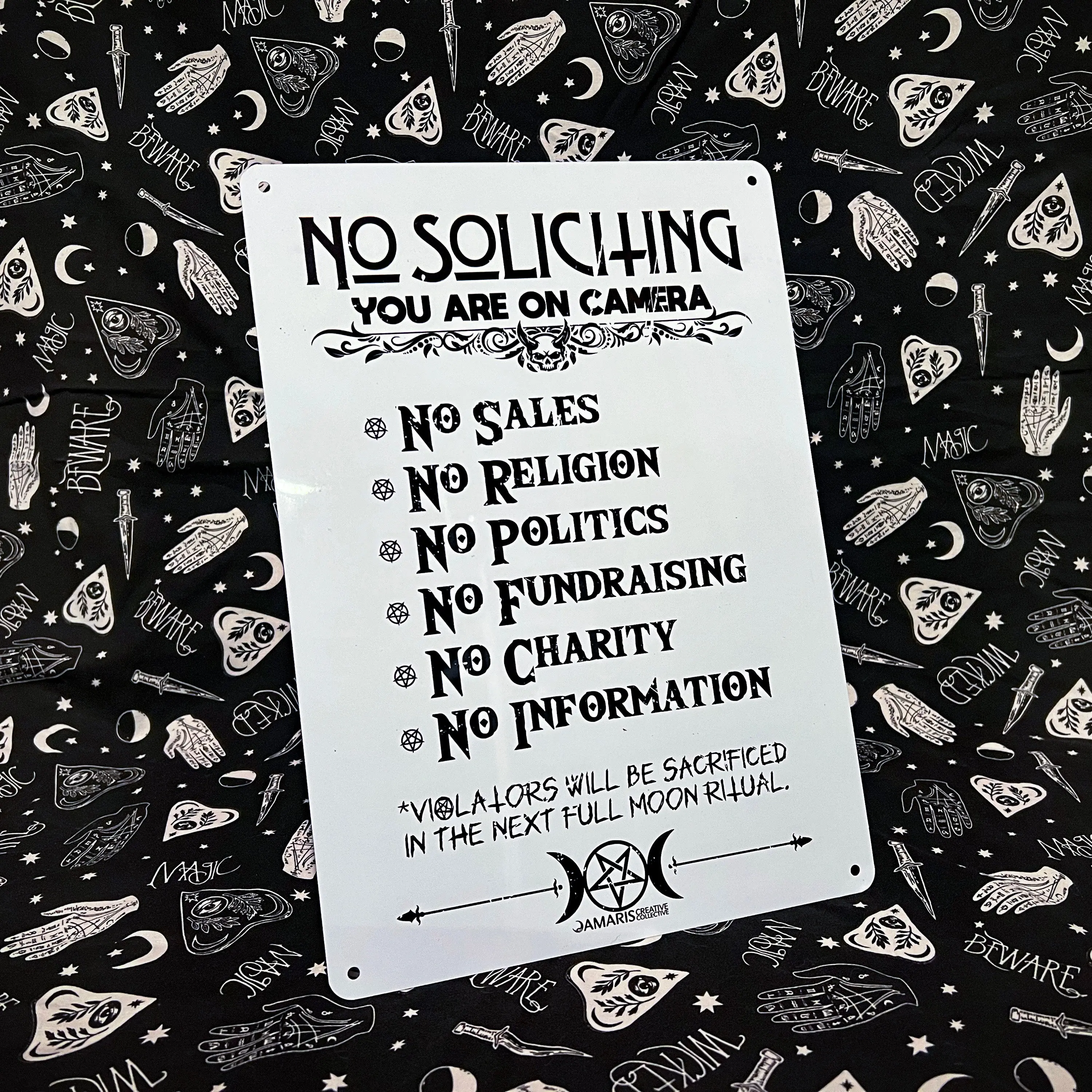 Tired of unwanted visitors? Want a sign that says it all? Our gothic twist on a no soliciting sign has got you covered. No sales, no religion, no politics, no fundraising, and no charity or information allowed. Keep the solicitors away in style.