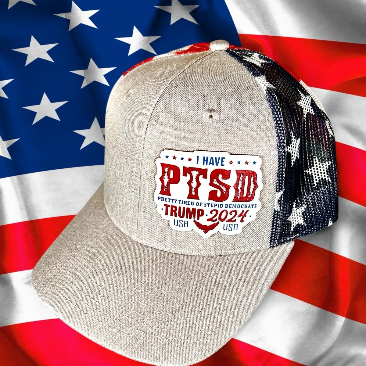 This trucker hat is a must-have for anyone who is tired of the "stupid Democrats" and supports Trump in 2024. The hat features an acrylic patch that says "PTSD" and "Pretty tired of stupid Democrats" in bold letters. The patch is designed to be eye-catching and make a statement, making it a great conversation starter.