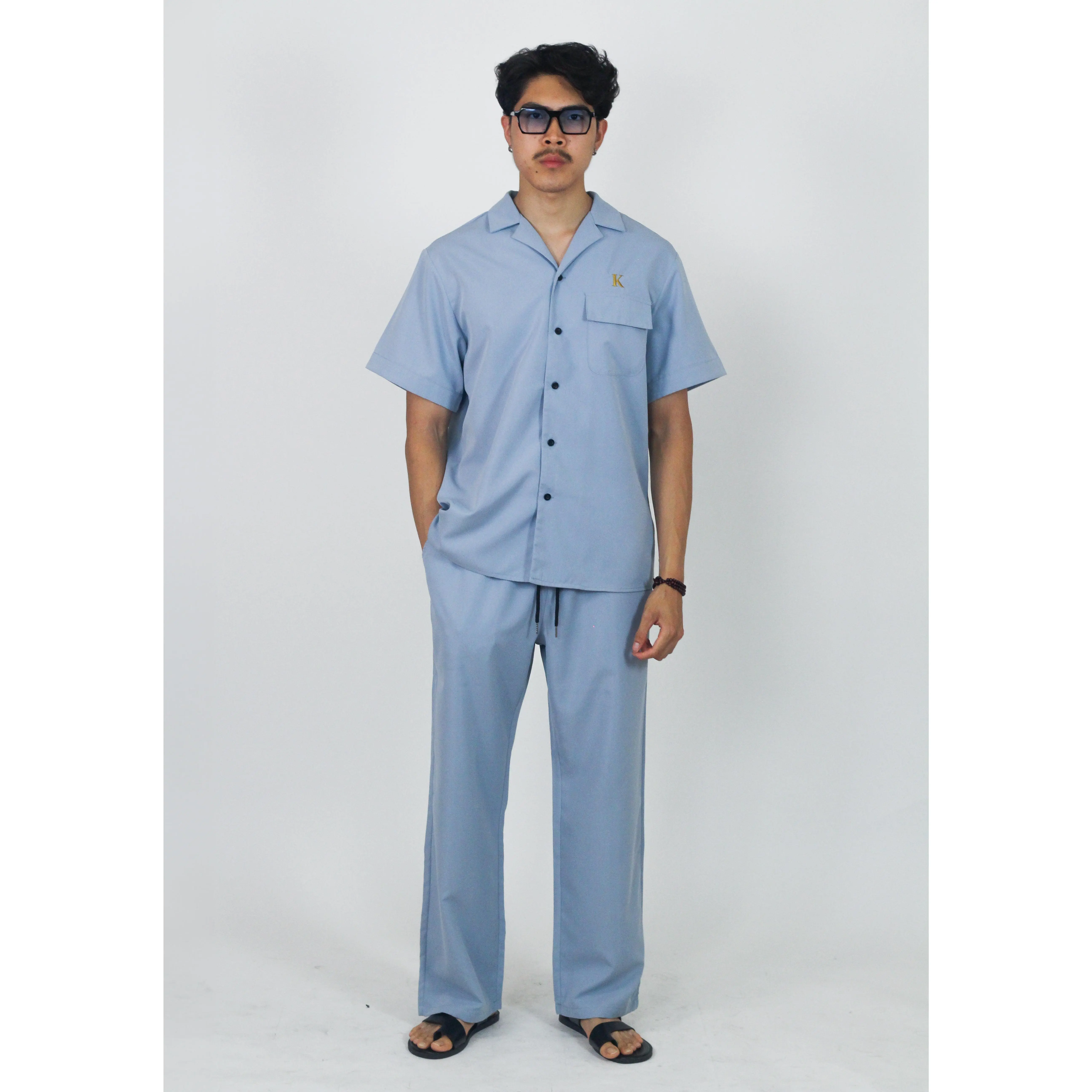 The Sky Blue 2-piece Men's Outfit Set includes pants with a stretch-adjustable waist and drawstring for a custom fit, paired with a classic button-down shirt featuring a stylish camp collar. Available in sky blue, this versatile set seamlessly transitions from day to night, making it ideal for both laid-back weekends and dressed-up evenings.